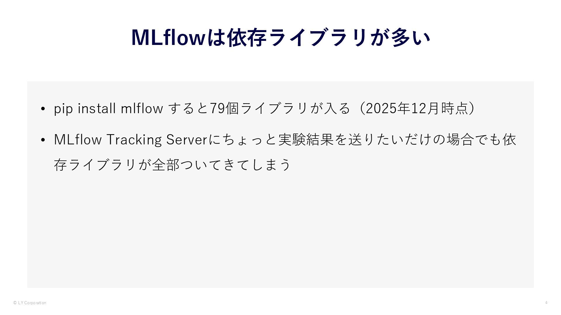Tracking Serverにちょっと実験結果を送りたいだけの場合でも依 存ライブラリが全部ついてきてしまう 4 MLflowは依存ライブラリが多い