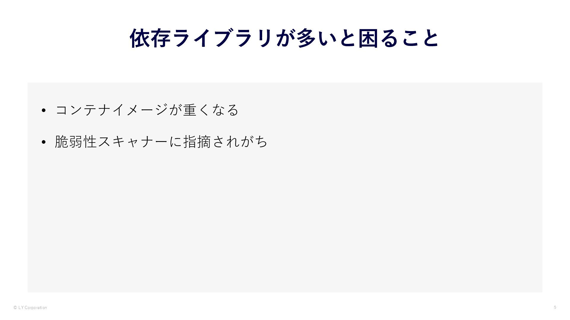 © LY Corporation • コンテナイメージが重くなる • 脆弱性スキャナーに指摘されがち 5 依存ライブラリが多いと困ること