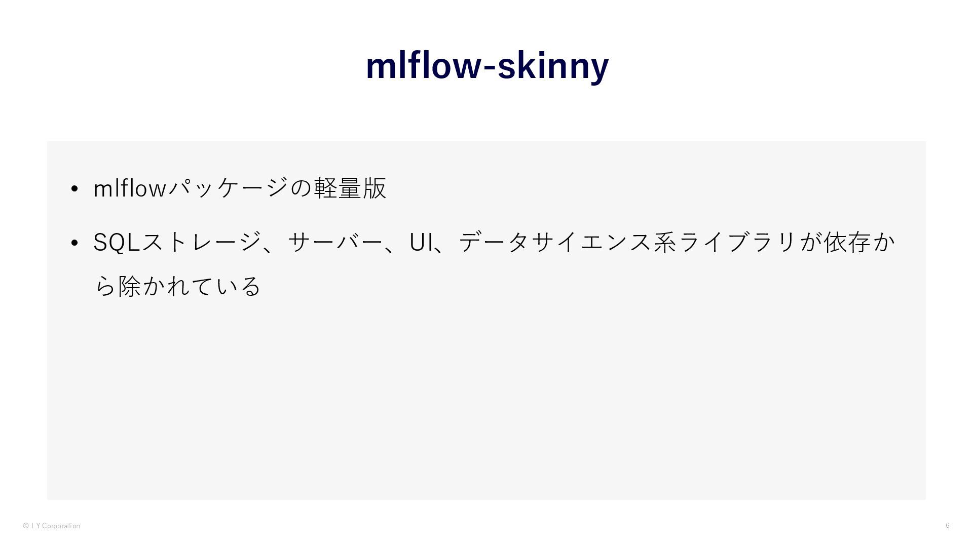 © LY Corporation • mlflowパッケージの軽量版 • SQLストレージ、サーバー、UI、データサイエンス系ライブラリが依存か ら除かれている 6 mlflow-skinny