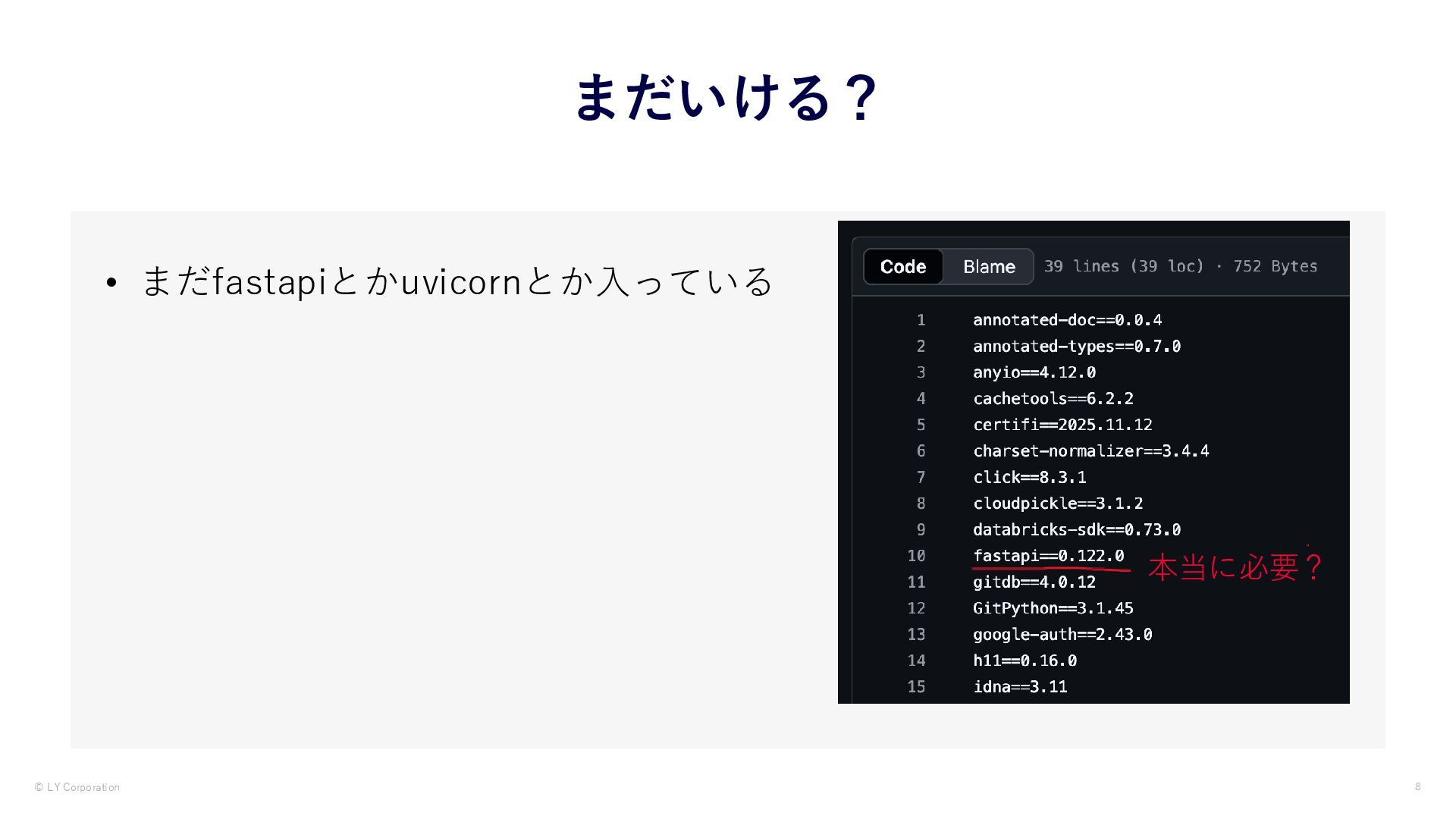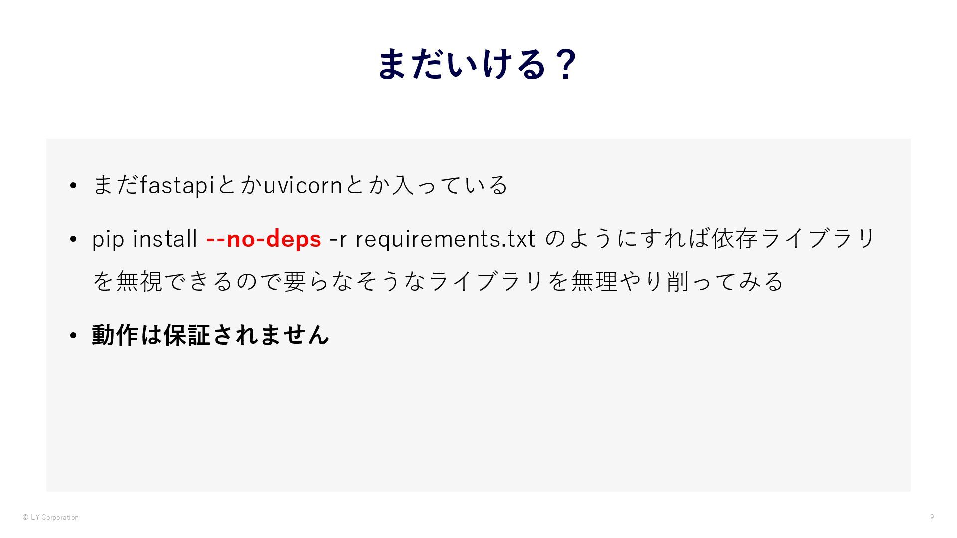 © LY Corporation • まだfastapiとかuvicornとか入っている 8 まだいける? 本当に必要?