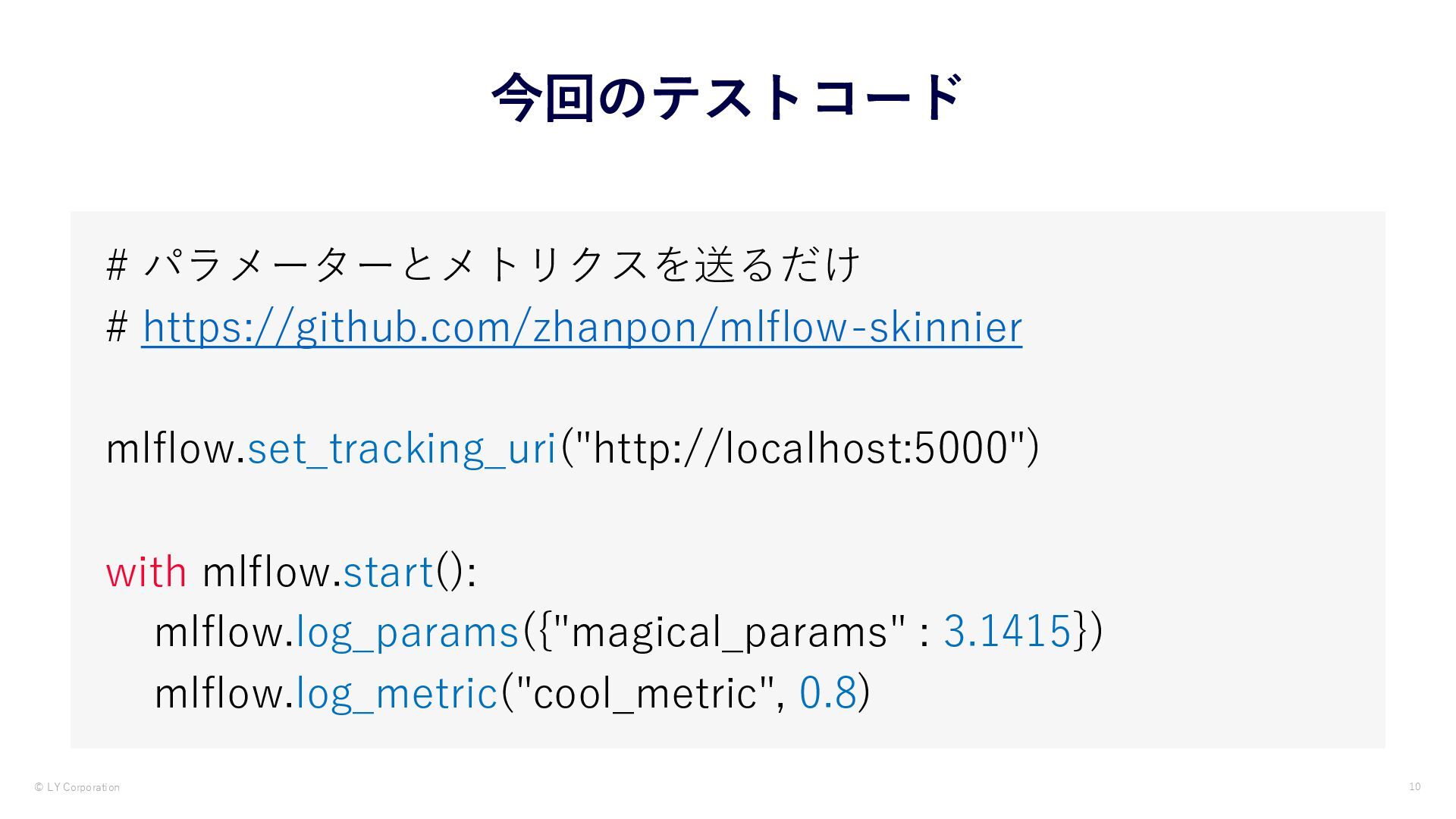 © LY Corporation # パラメーターとメトリクスを送るだけ # https://github.com/zhanpon/mlflow-skinnier mlflow.set_tracking_uri("http://localhost:5000") with mlflow.start():