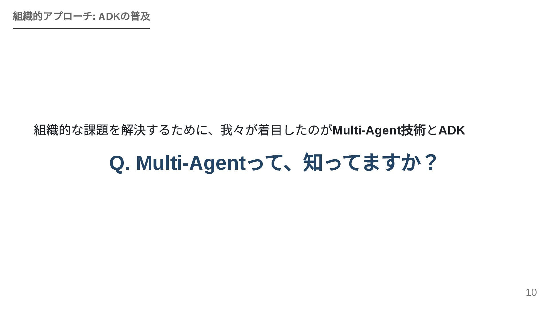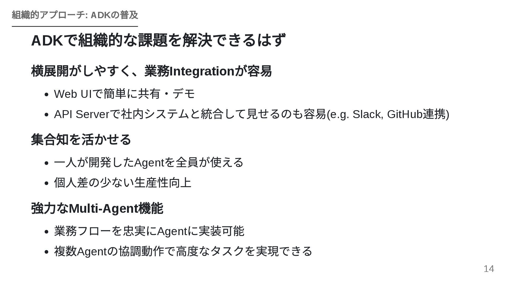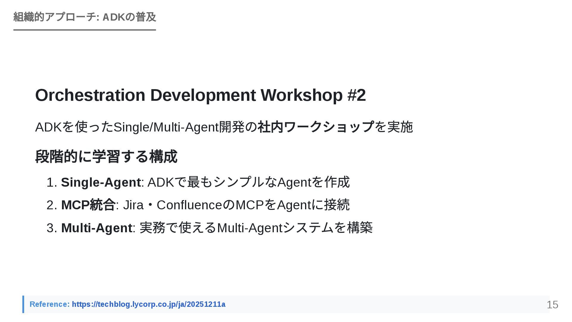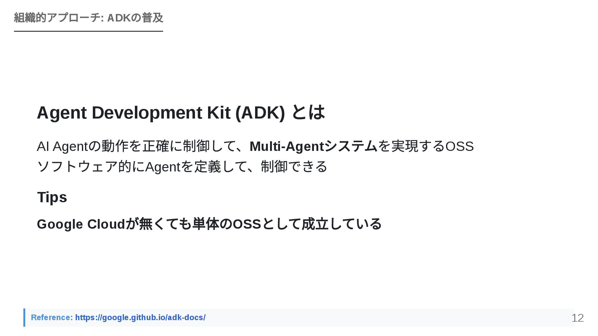 GoogleのOSSフレームワークADK(Agent Development Kit)を活用し、個人で構築したエージェントワークフローを組織全体のAPIとして横展開する戦略を紹介します。JIRA・Confluence・社内APIとのMCP連携、マルチエージェントによるプロジェクトトラッカーのライブデモ、ローカルツールとADKを組み合わせた現実的な組織展開モデルを解説します。