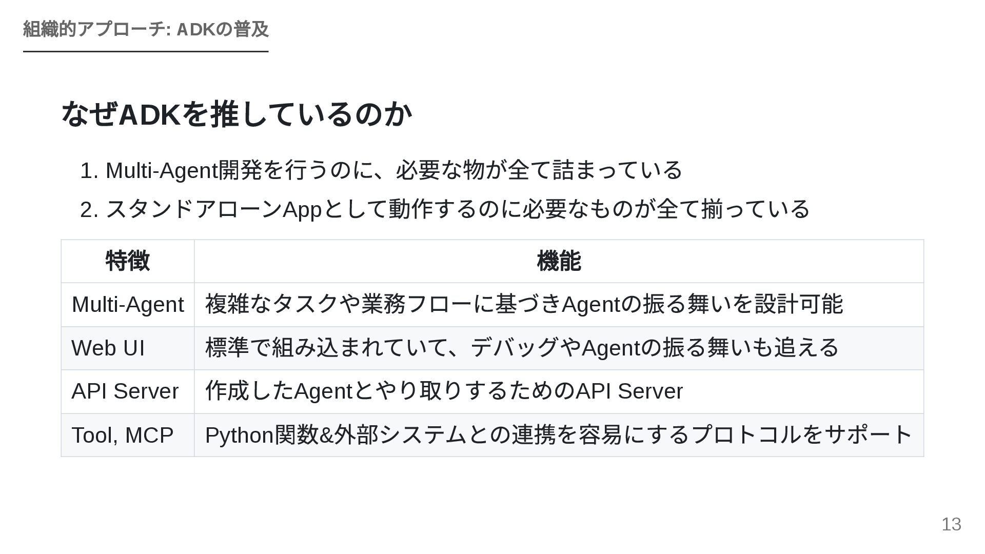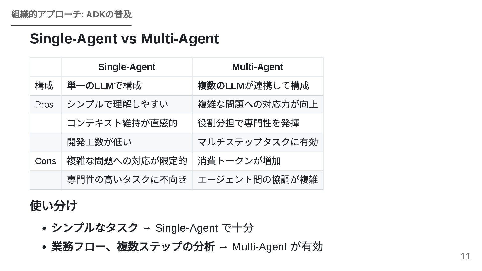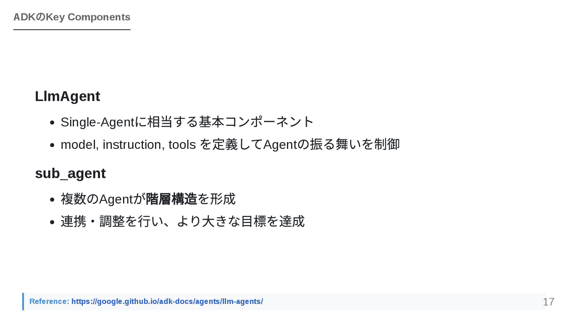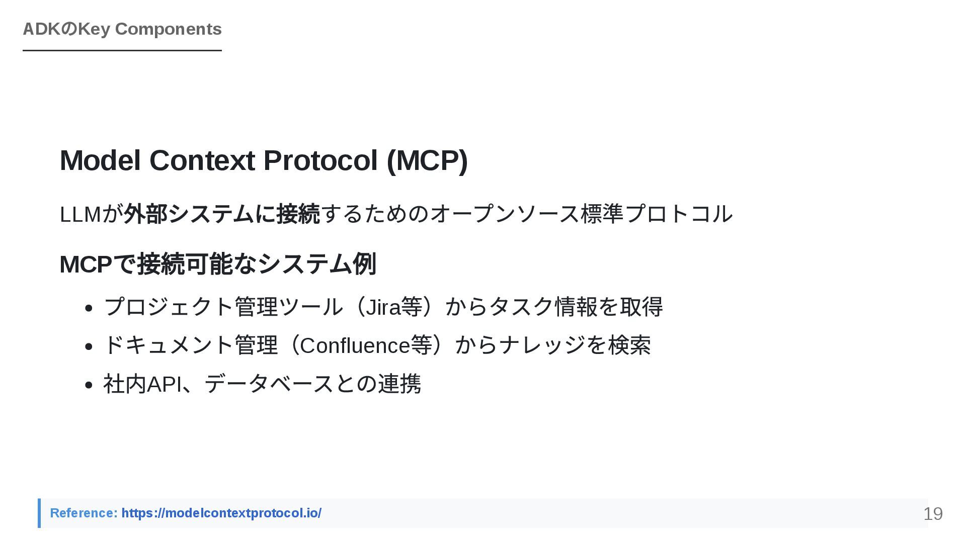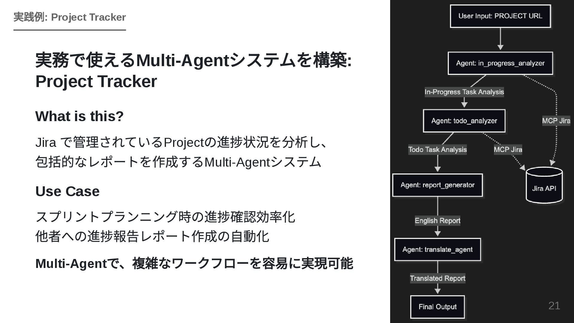 GoogleのOSSフレームワークADK(Agent Development Kit)を活用し、個人で構築したエージェントワークフローを組織全体のAPIとして横展開する戦略を紹介します。JIRA・Confluence・社内APIとのMCP連携、マルチエージェントによるプロジェクトトラッカーのライブデモ、ローカルツールとADKを組み合わせた現実的な組織展開モデルを解説します。