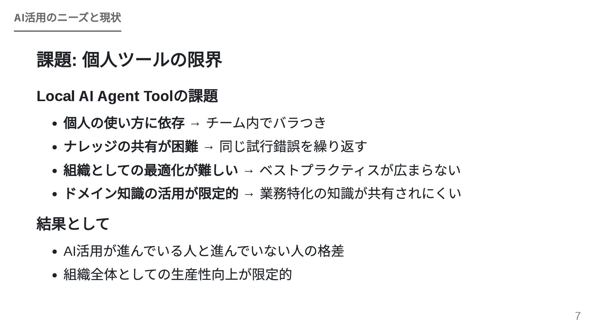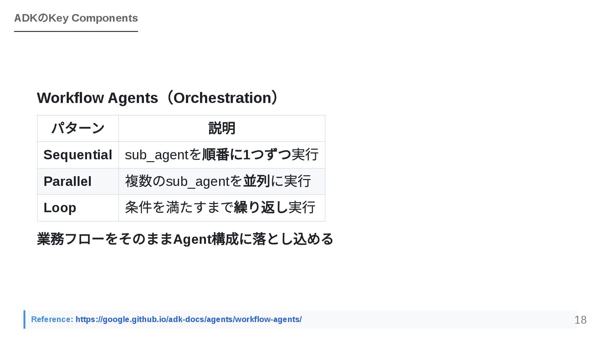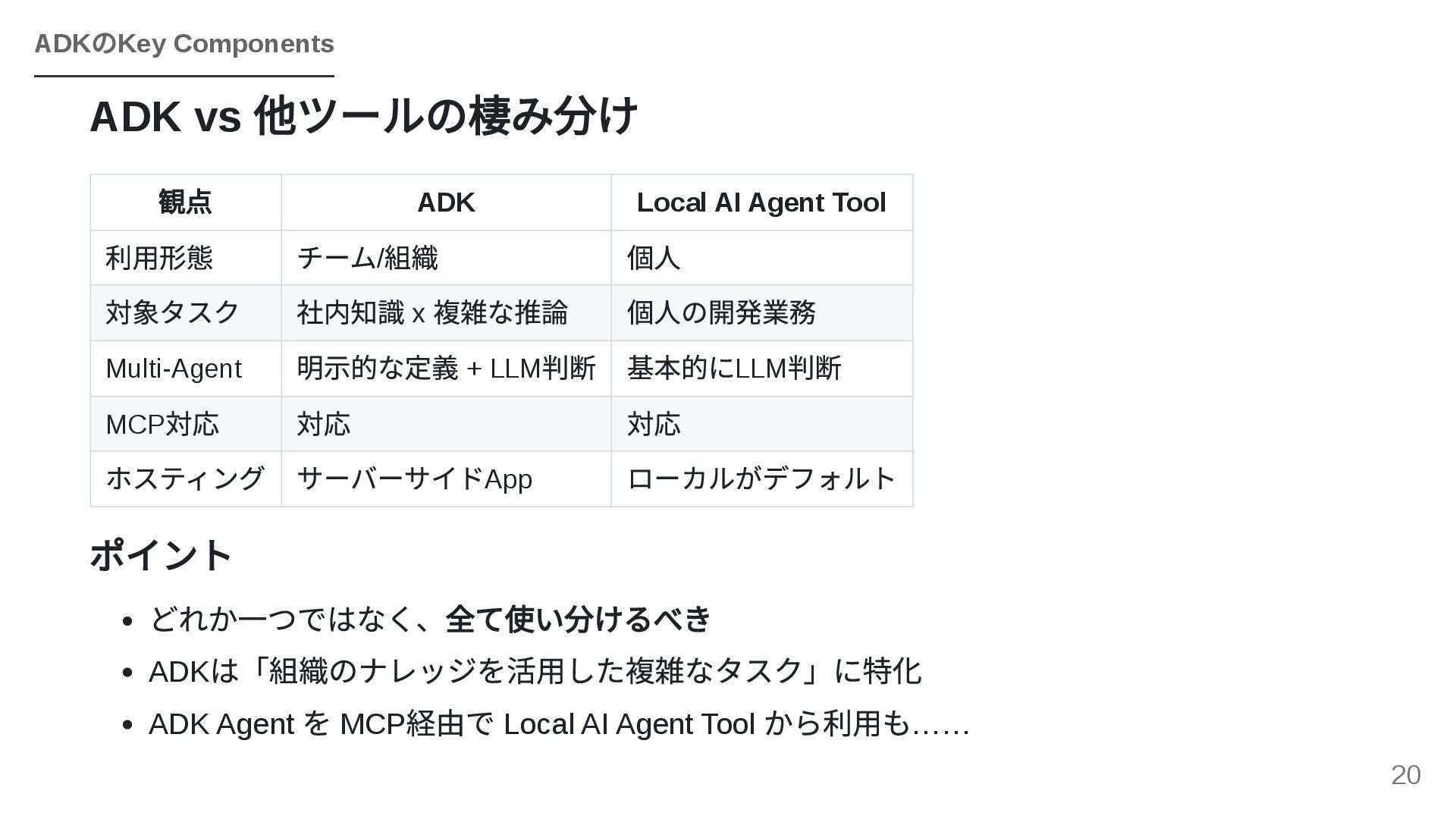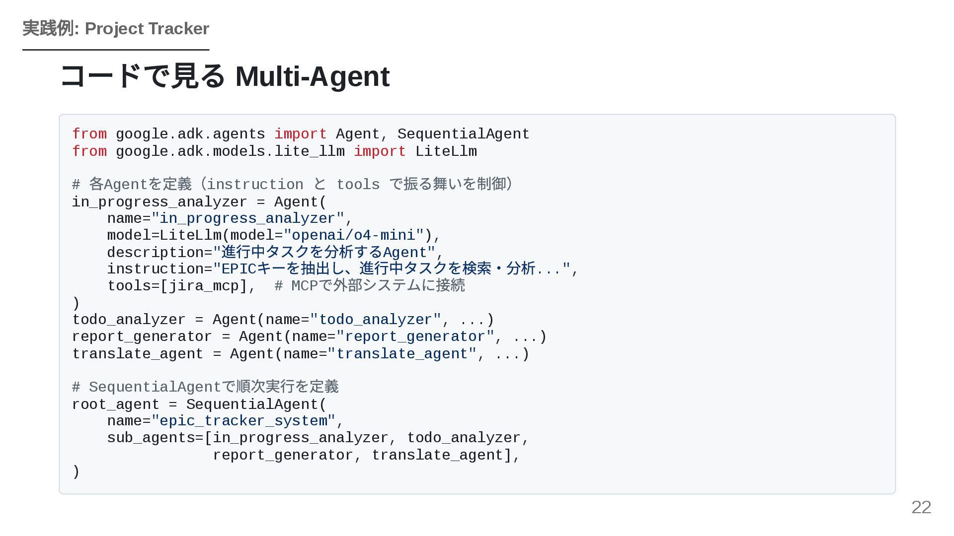 GoogleのOSSフレームワークADK(Agent Development Kit)を活用し、個人で構築したエージェントワークフローを組織全体のAPIとして横展開する戦略を紹介します。JIRA・Confluence・社内APIとのMCP連携、マルチエージェントによるプロジェクトトラッカーのライブデモ、ローカルツールとADKを組み合わせた現実的な組織展開モデルを解説します。