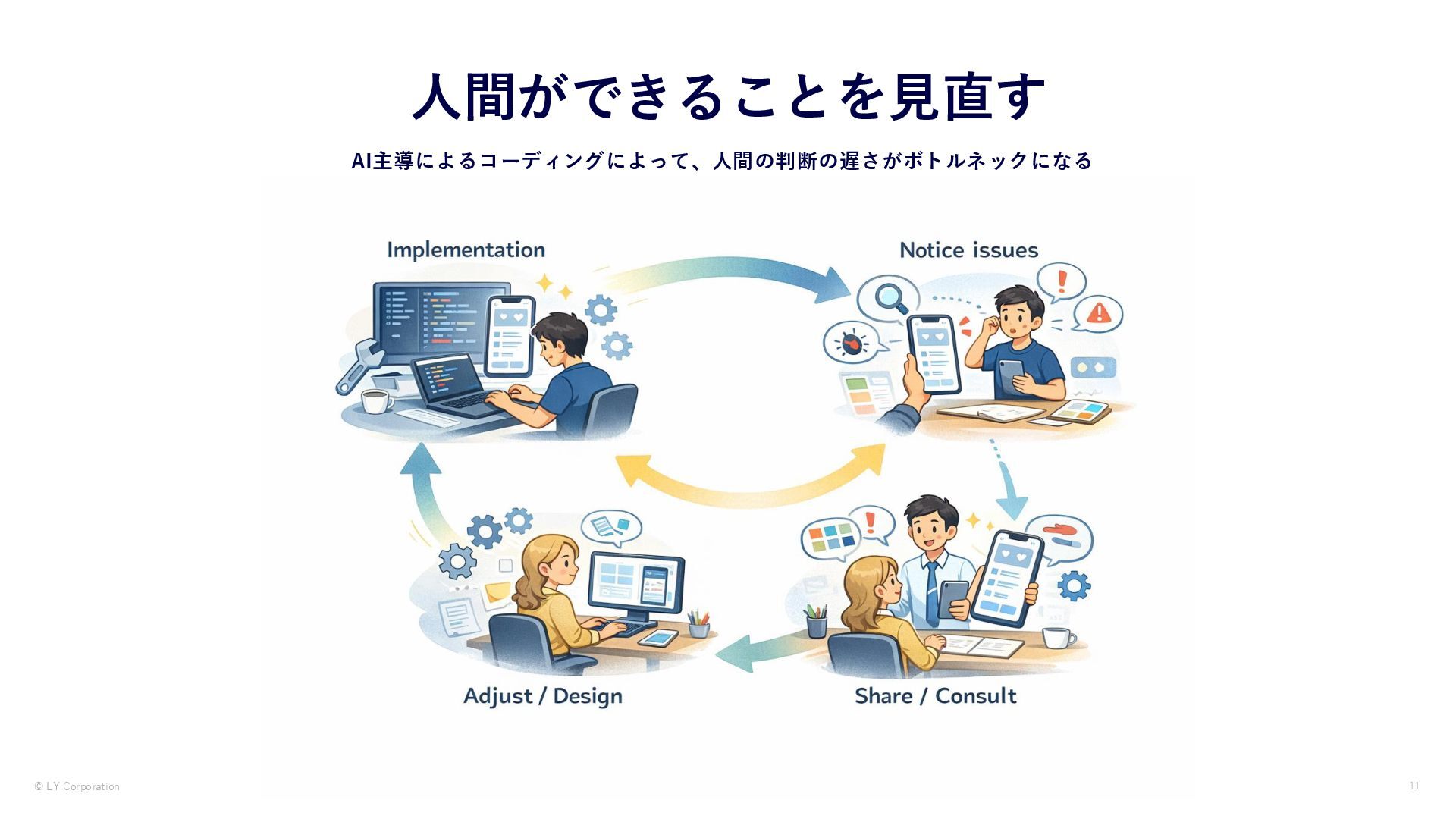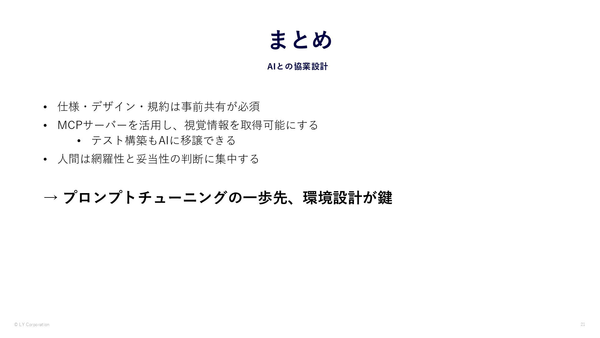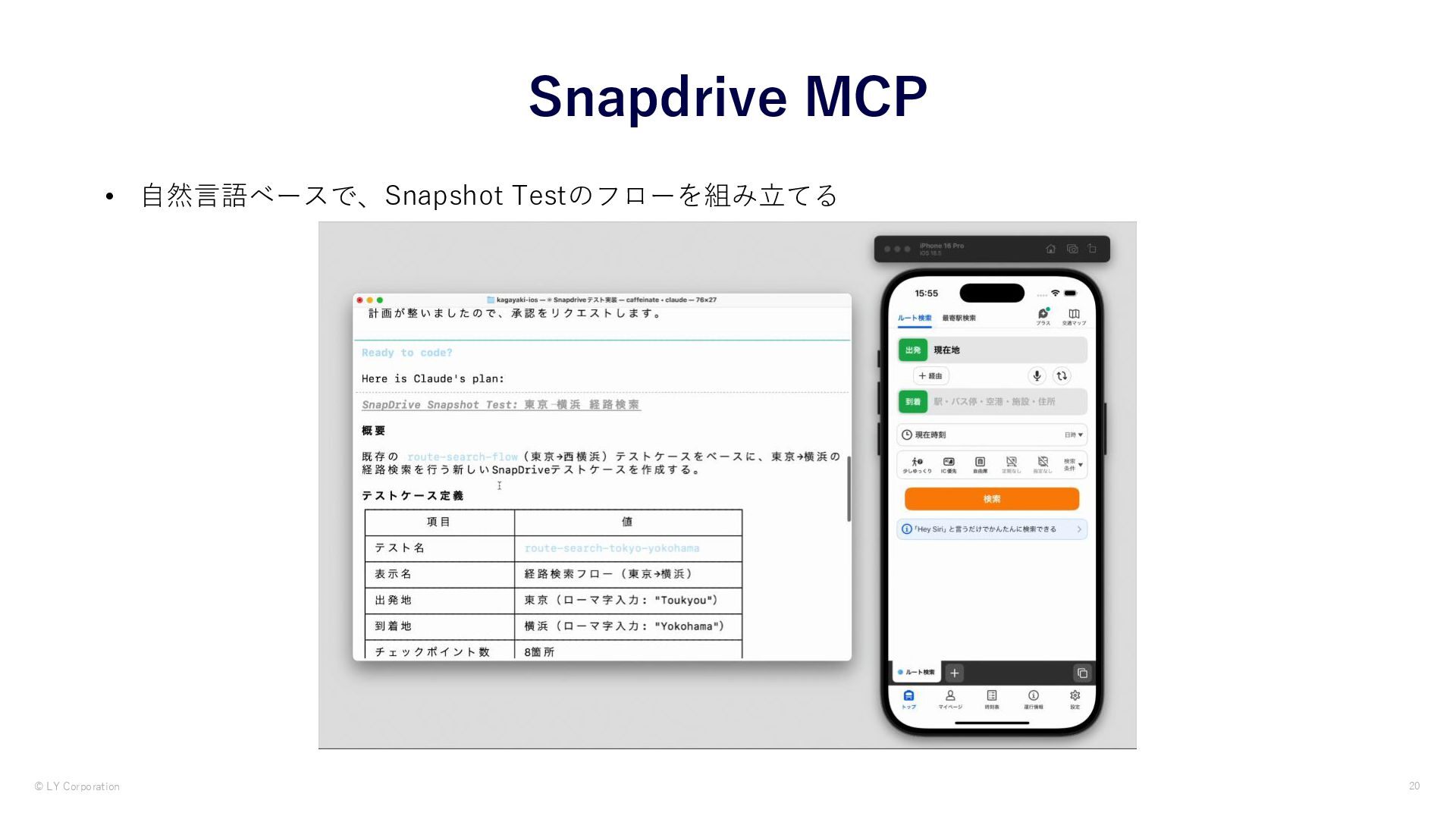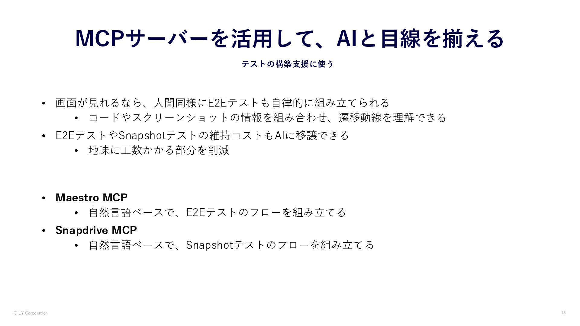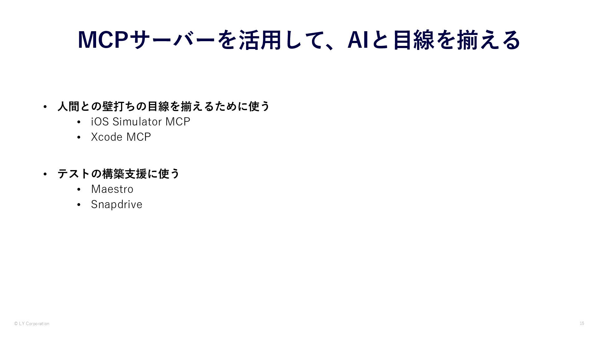 AIはコードを読めても「画面の状態」を自分で確認できません。本資料では、MCPサーバー経由でAIにシミュレーターを操作させ視覚を与えることで、iOSアプリのUIテストを自律化した実践を紹介します。iOS Simulator MCP・Xcode MCP・Maestro MCP・独自開発Snap Drive MCPの4つの手法と、プロンプト設計より環境設計が鍵になるという知見を紹介しています。