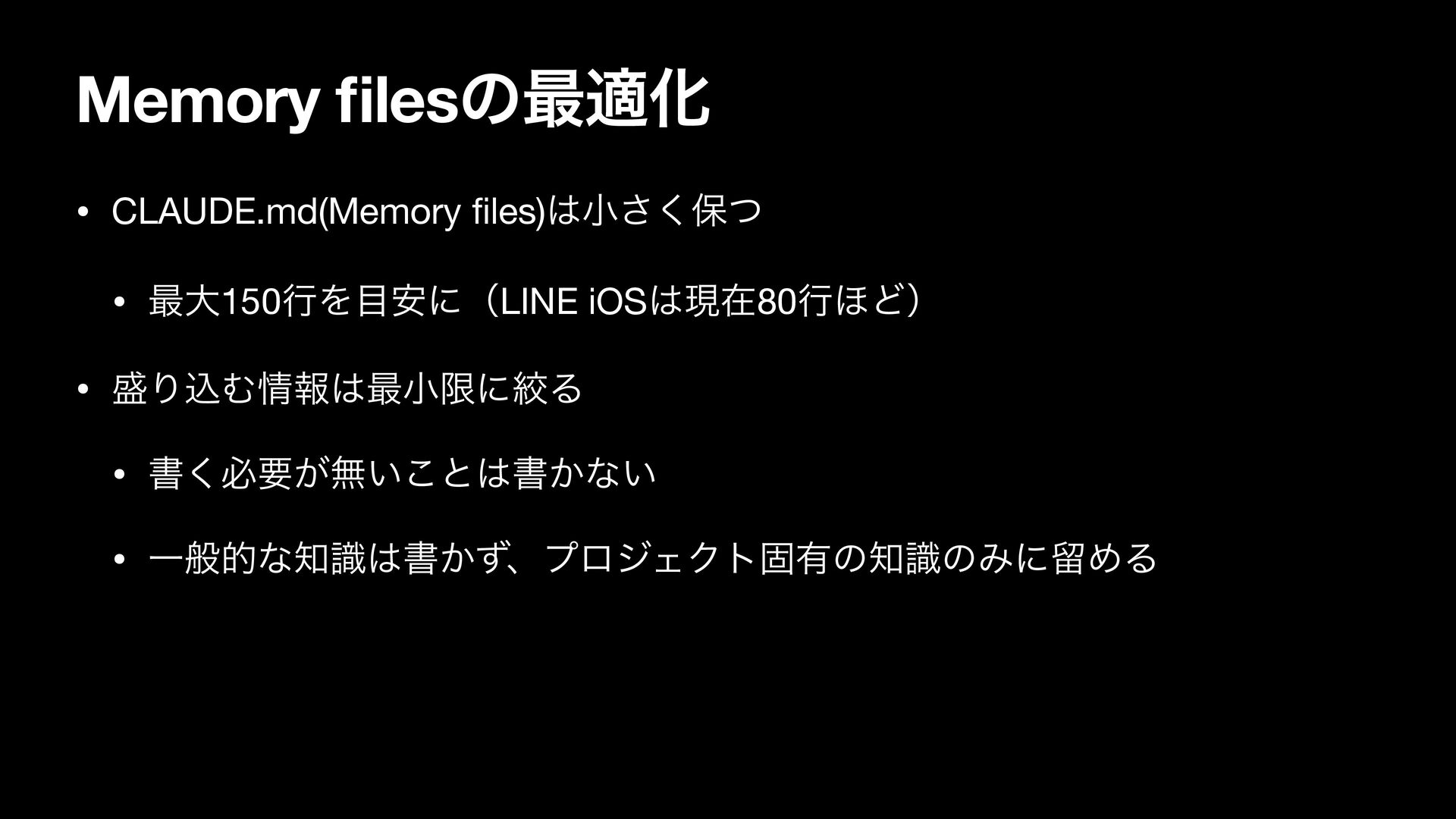 4. Memory fi lesͷ࠷దԽ • CLAUDE.md(Memory fi les)͸খ͘͞อͭ • ࠷େ150ߦΛ໨҆ʹʢLINE iOS͸ݱࡏ80ߦ΄Ͳʣ