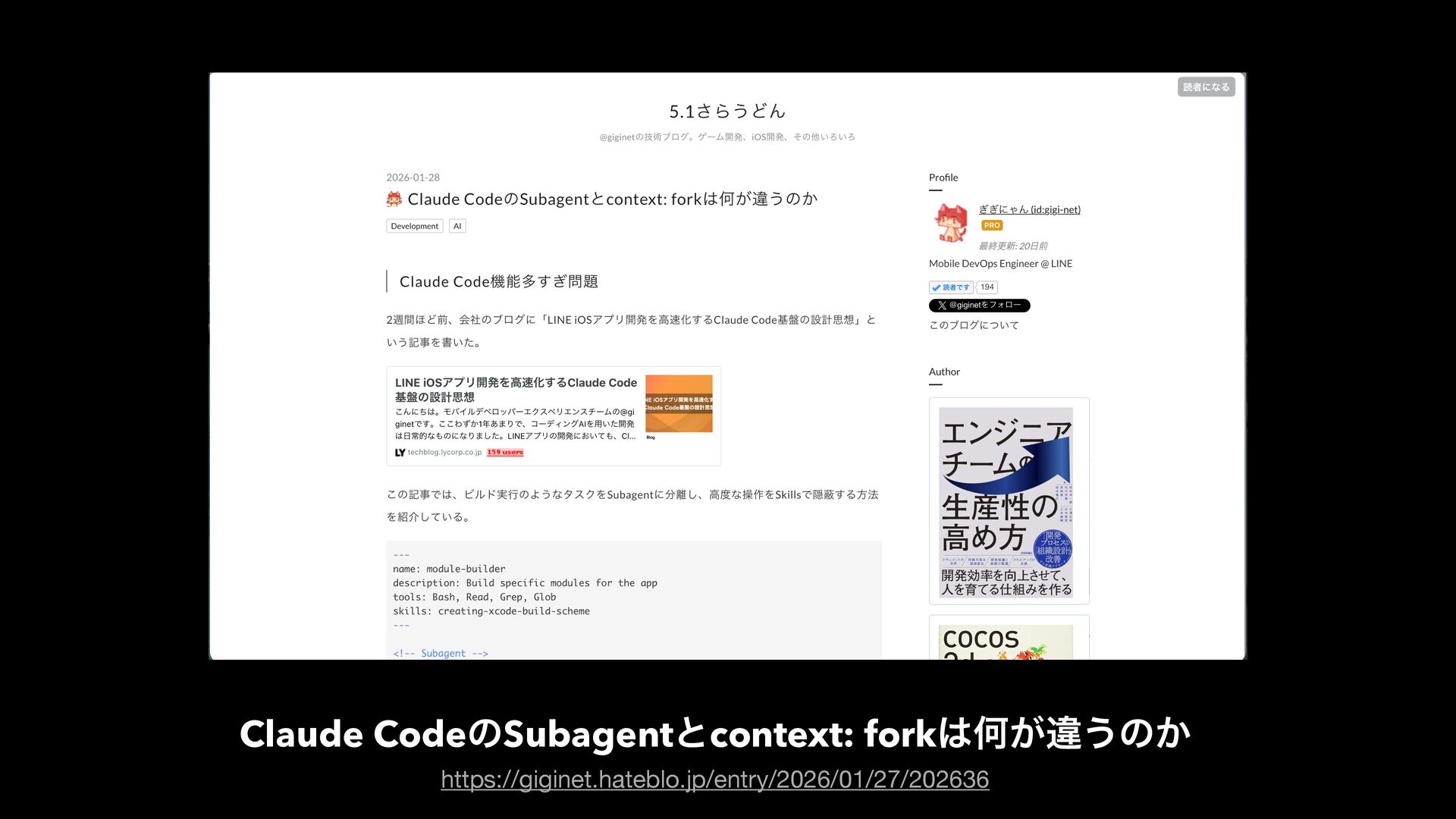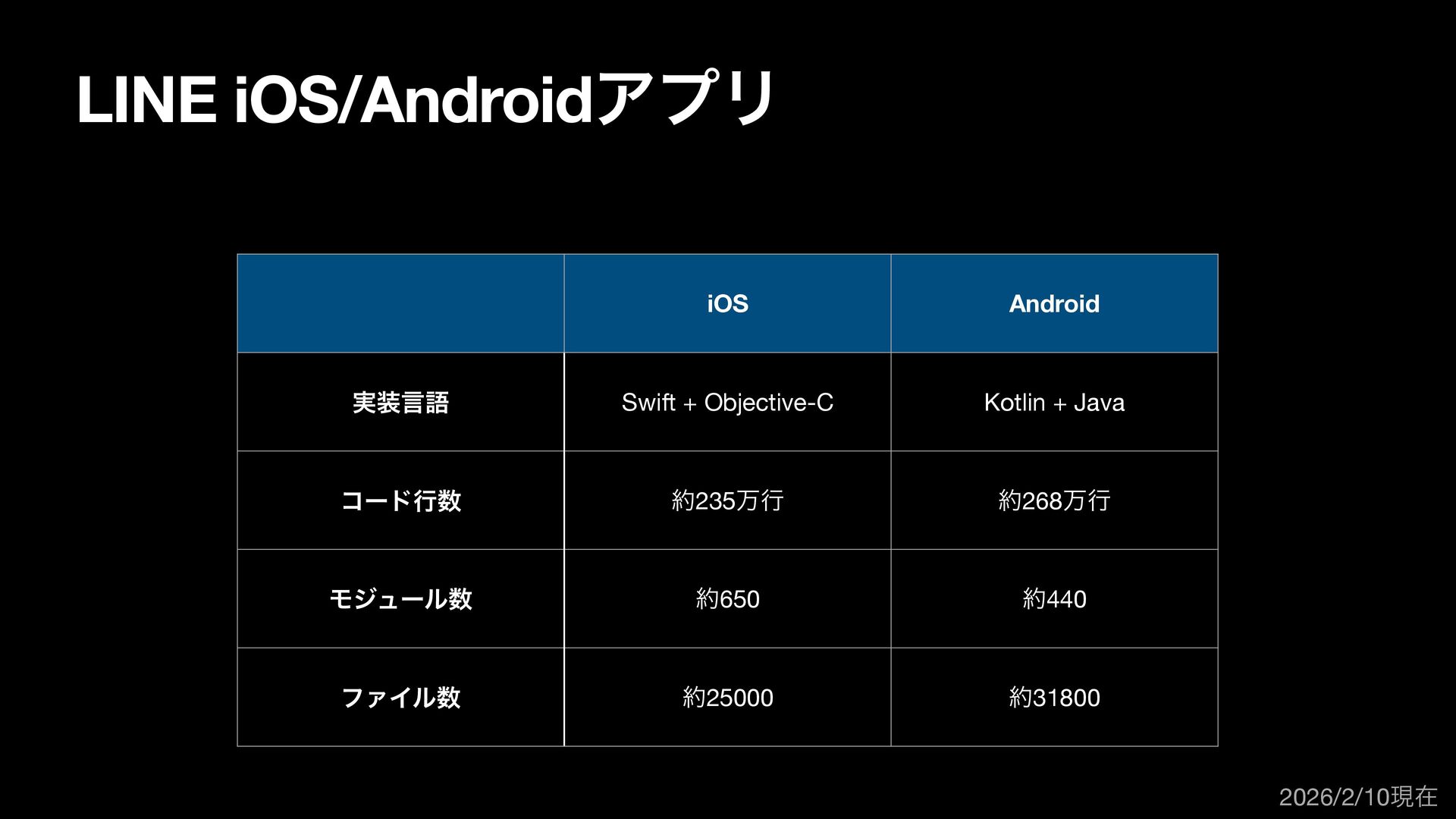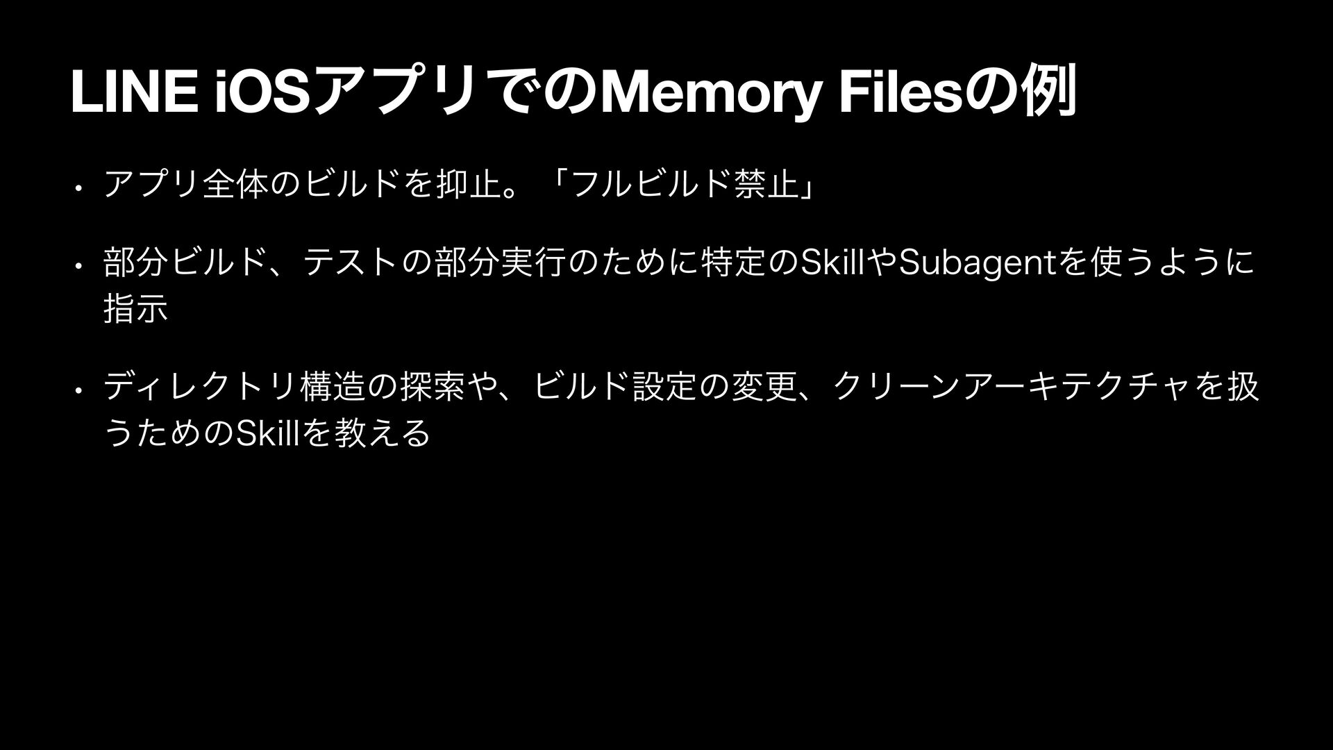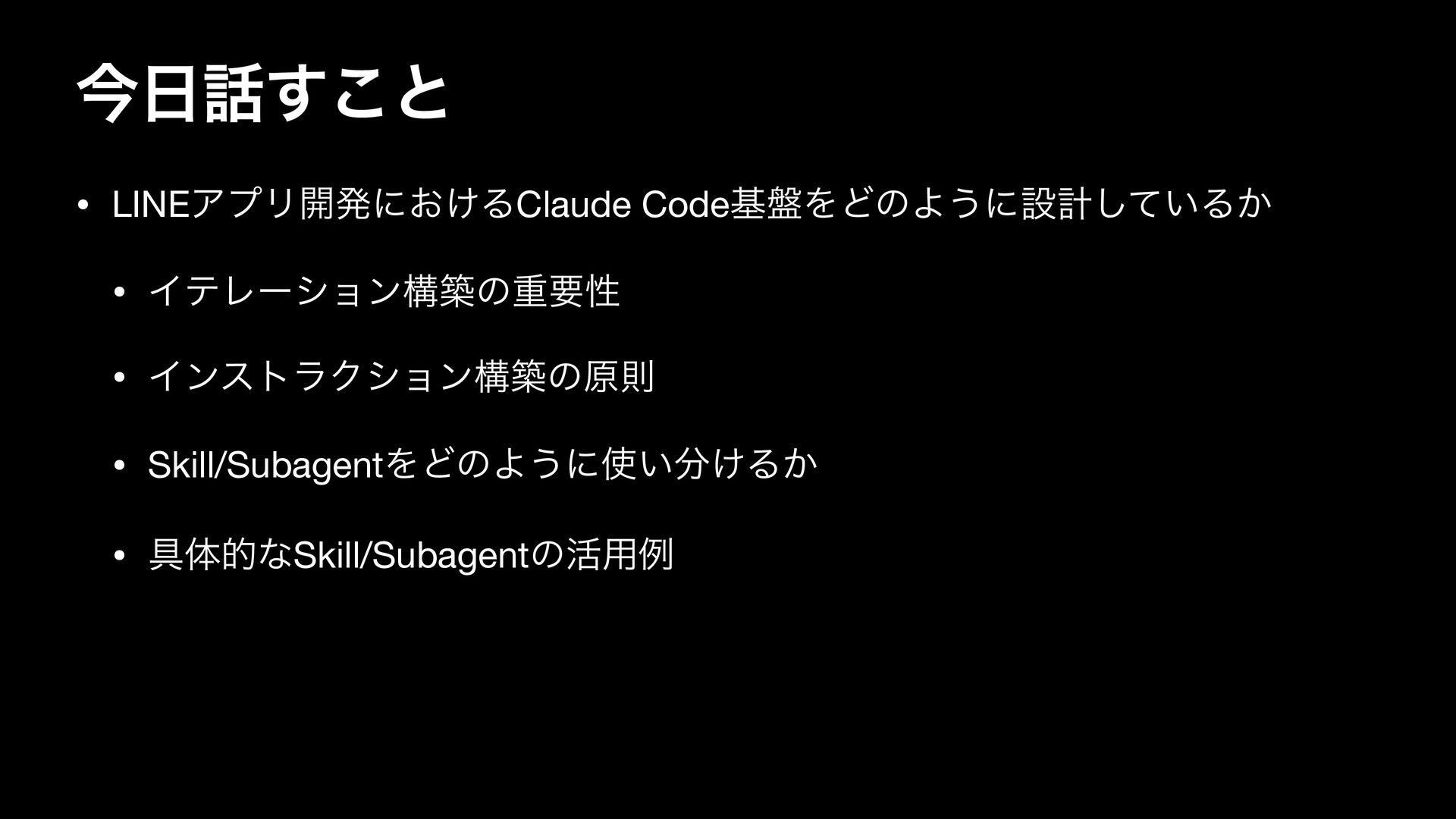 iOS約235万行・Android約268万行という巨大なLINEアプリのリポジトリでClaude Codeを使うための基盤設計を紹介します。「コンテキストは公共の財産」という思想のもと約150行に絞ったCLAUDE.mdの設計原則、パッシブ/アクティブに分けたエージェントスキル、ログをサブエージェントに隔離してノイズを減らす構造、フィードバックループを高速に回すための環境整備を紹介しています。