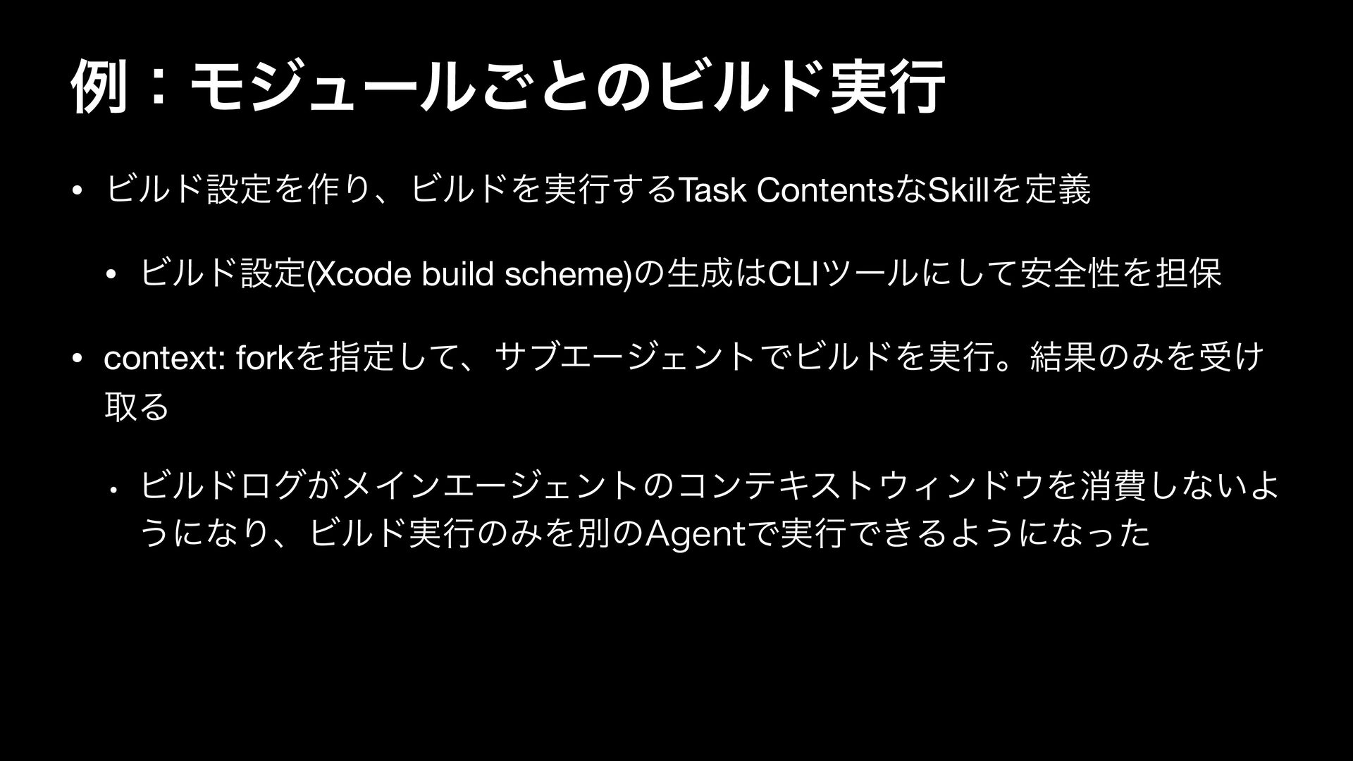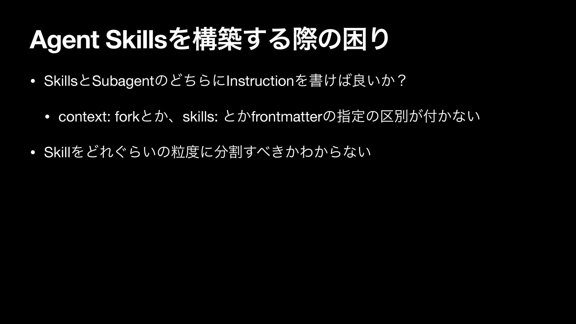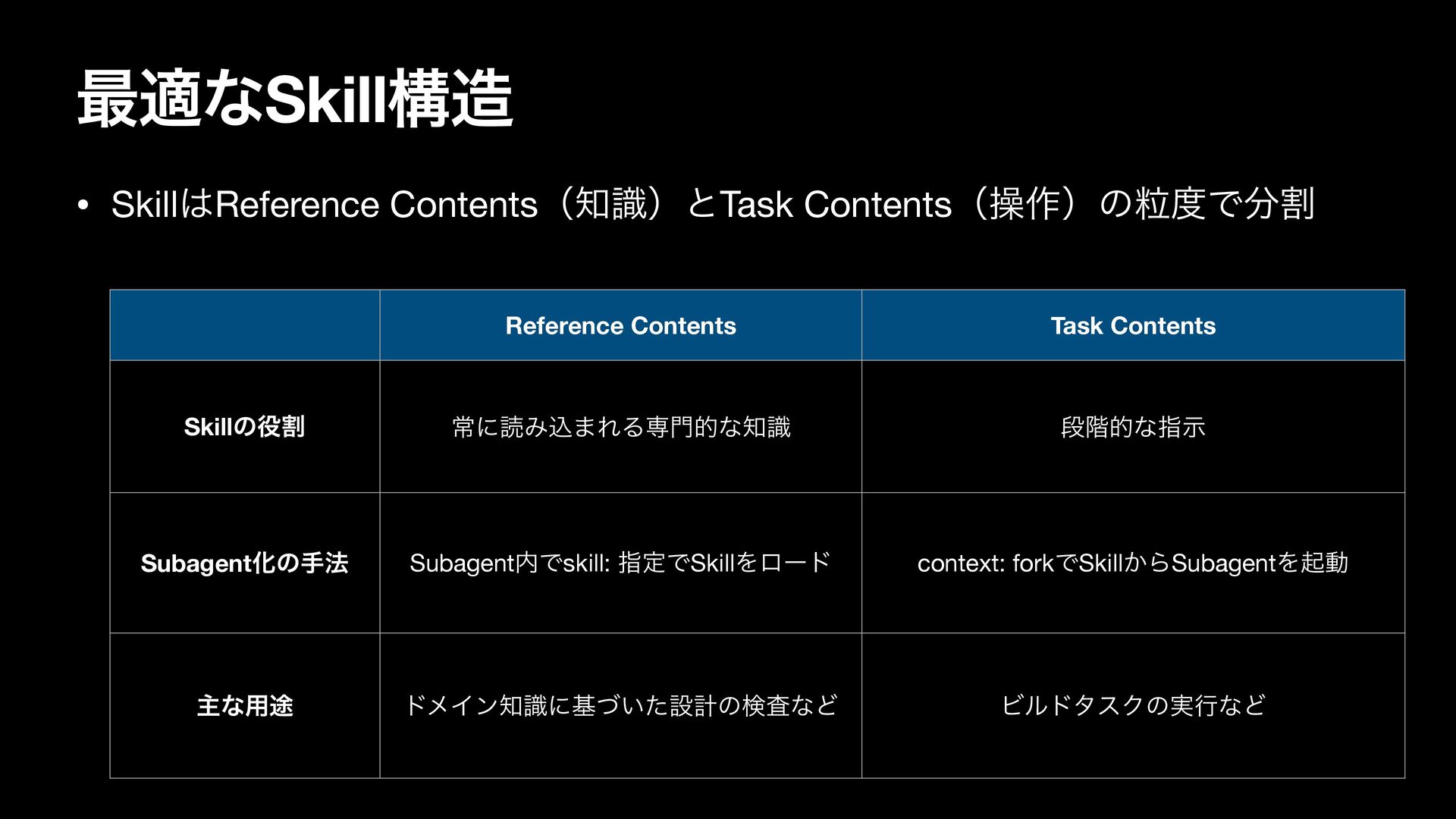 ৗʹಡΈࠐ·ΕΔઐ໳తͳ஌ࣝ ஈ֊తͳࢦࣔ SubagentԽͷख๏ Subagent಺Ͱskill: ࢦఆͰSkillΛϩʔυ context: forkͰSkill͔ΒSubagentΛىಈ ओͳ༻్ υϝΠϯ஌ࣝʹج͍ͮͨઃܭͷݕࠪͳͲ ϏϧυλεΫͷ࣮ߦͳͲ