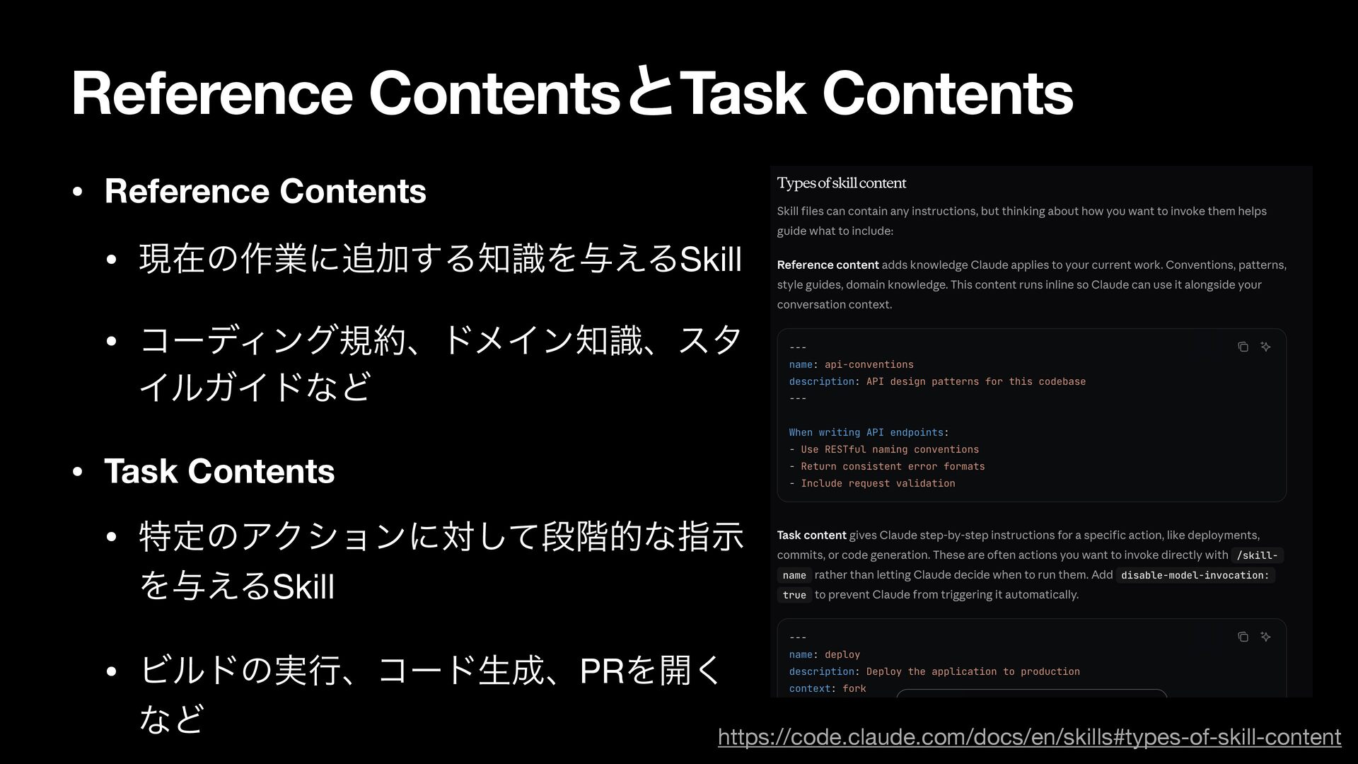 ΠϧΨΠυͳͲ • Task Contents • ಛఆͷΞΫγϣϯʹରͯ͠ஈ֊తͳࢦࣔ Λ༩͑ΔSkill • Ϗϧυͷ࣮ߦɺίʔυੜ੒ɺPRΛ։͘ ͳͲ https://code.claude.com/docs/en/skills#types-of-skill-content