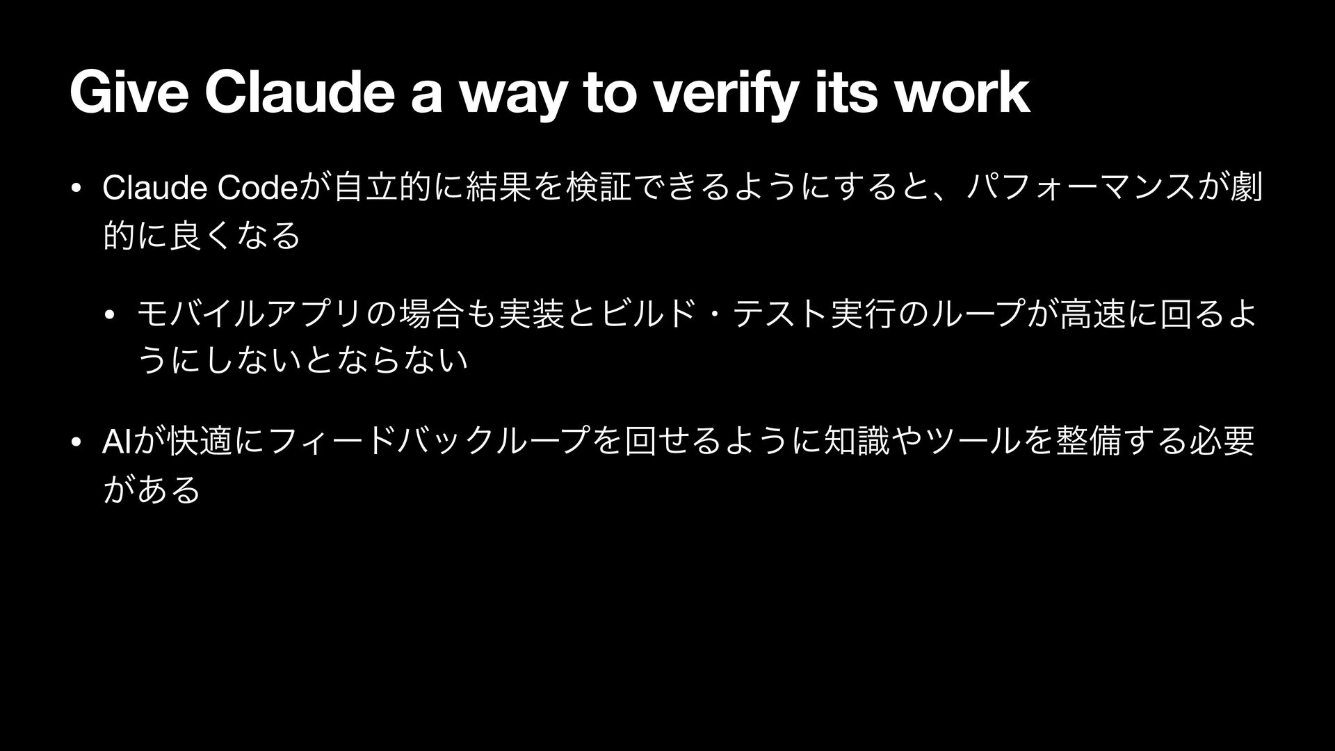 Codeཱ͕ࣗతʹ݁ՌΛݕূͰ͖ΔΑ͏ʹ͢ΔͱɺύϑΥʔϚϯε͕ܶ తʹྑ͘ͳΔ • ϞόΠϧΞϓϦͷ৔߹΋࣮૷ͱϏϧυɾςετ࣮ߦͷϧʔϓ͕ߴ଎ʹճΔΑ ͏ʹ͠ͳ͍ͱͳΒͳ͍ • AI͕շదʹϑΟʔυόοΫϧʔϓΛճͤΔΑ͏ʹ஌ࣝ΍πʔϧΛ੔උ͢Δඞཁ ͕͋Δ
