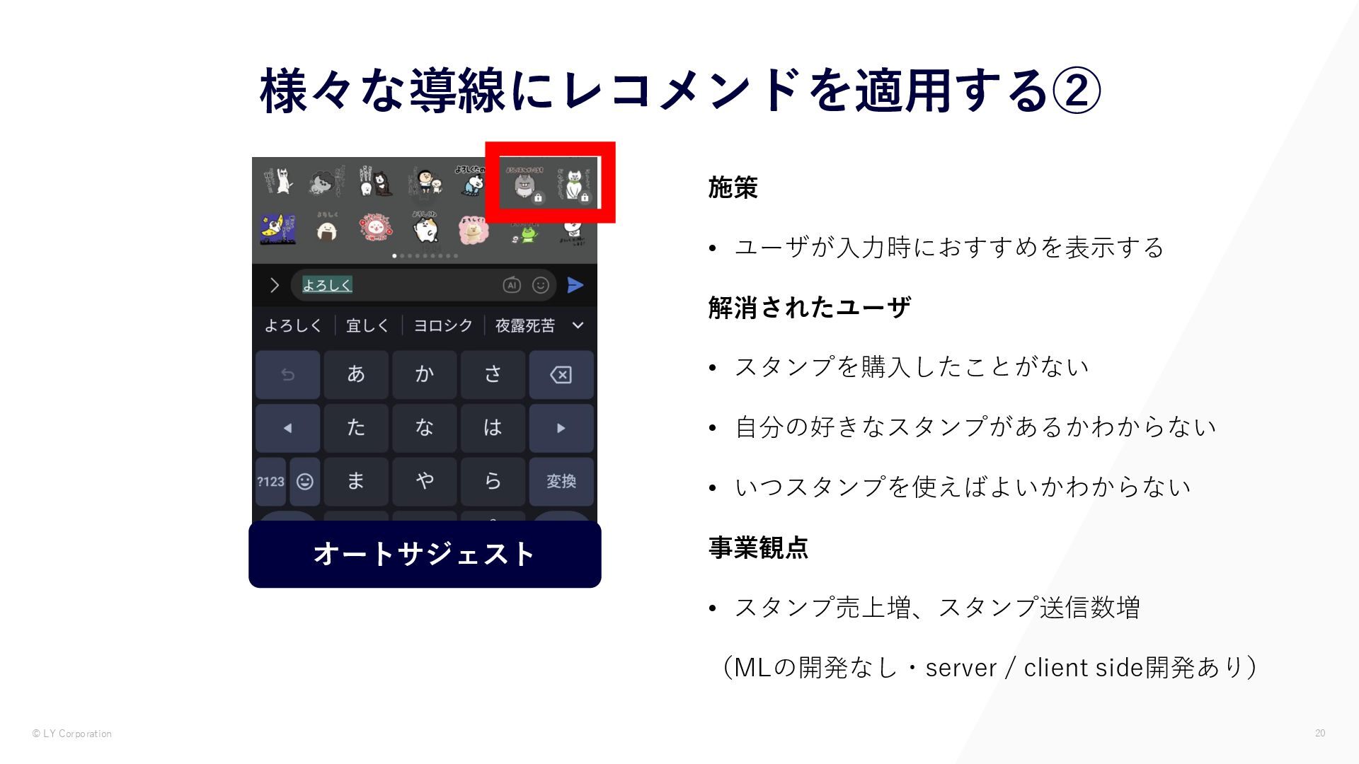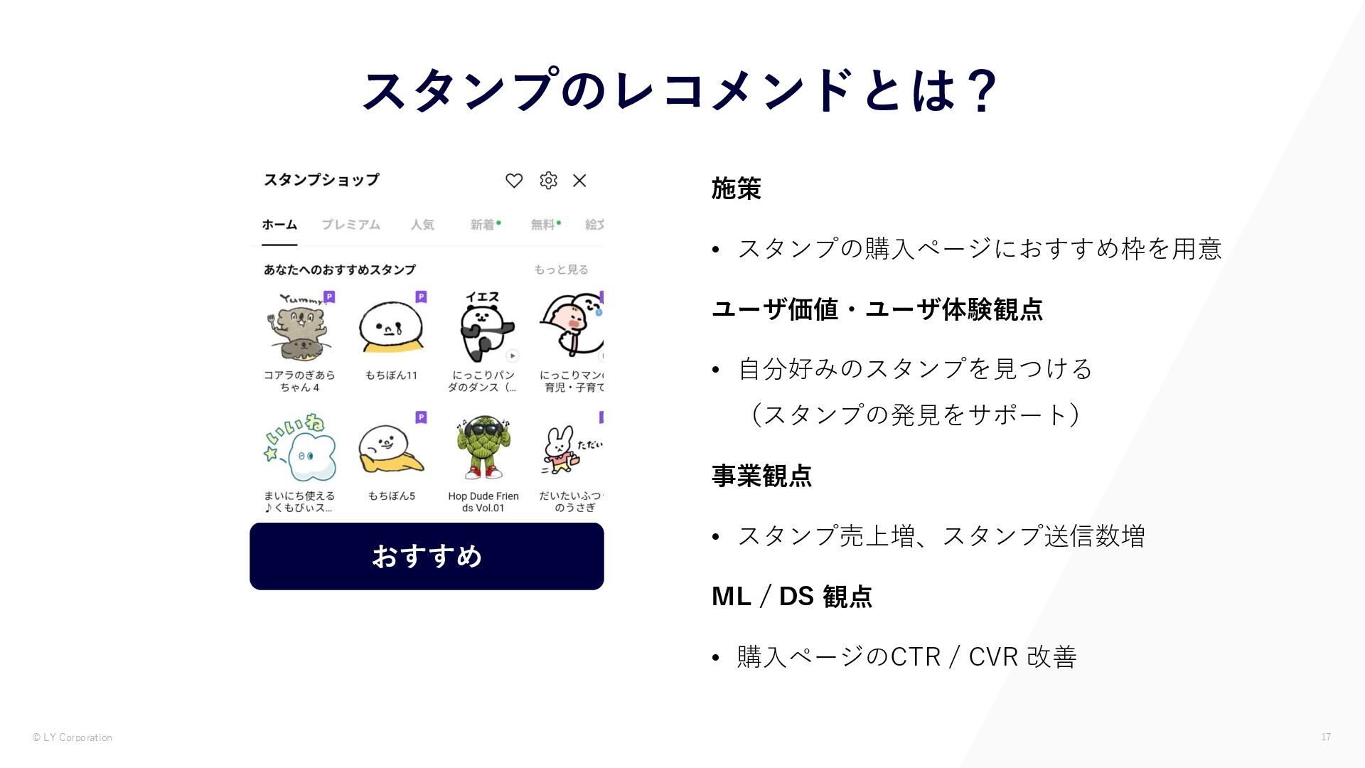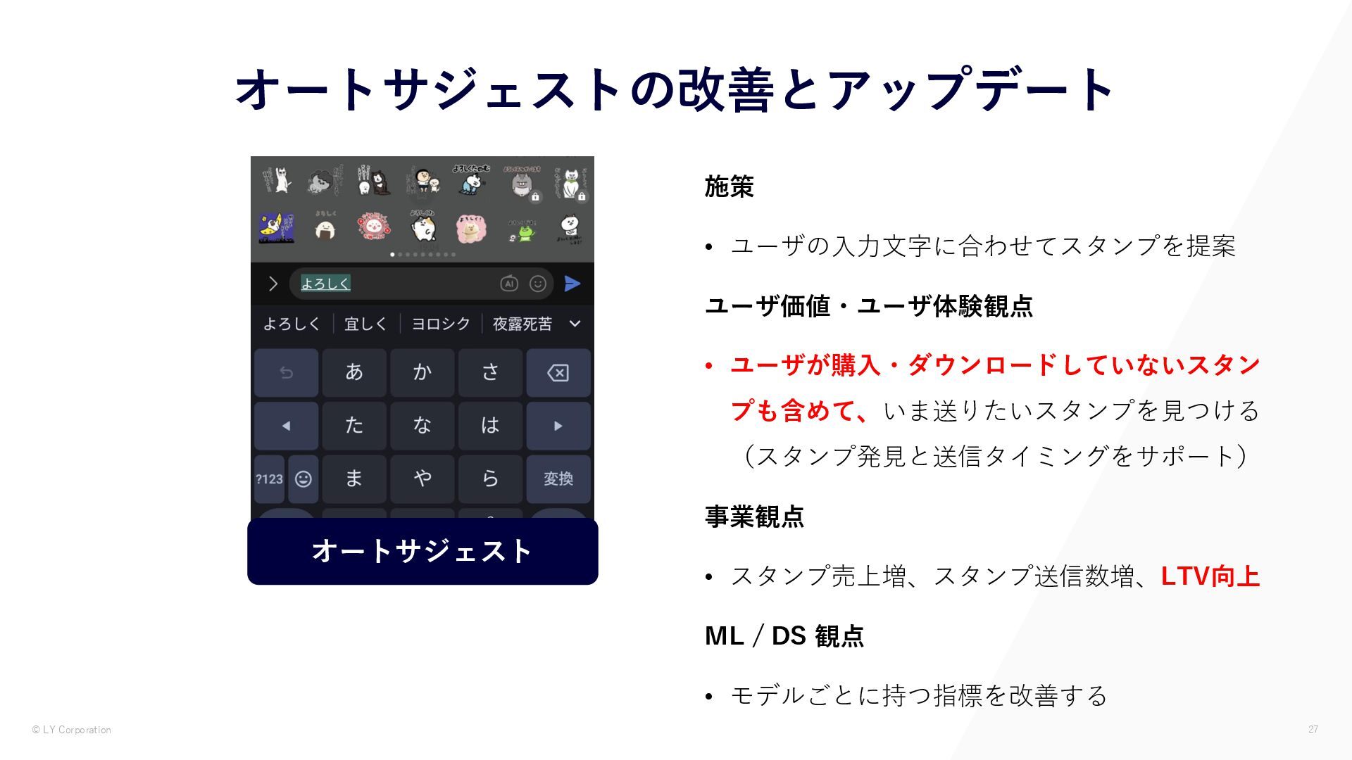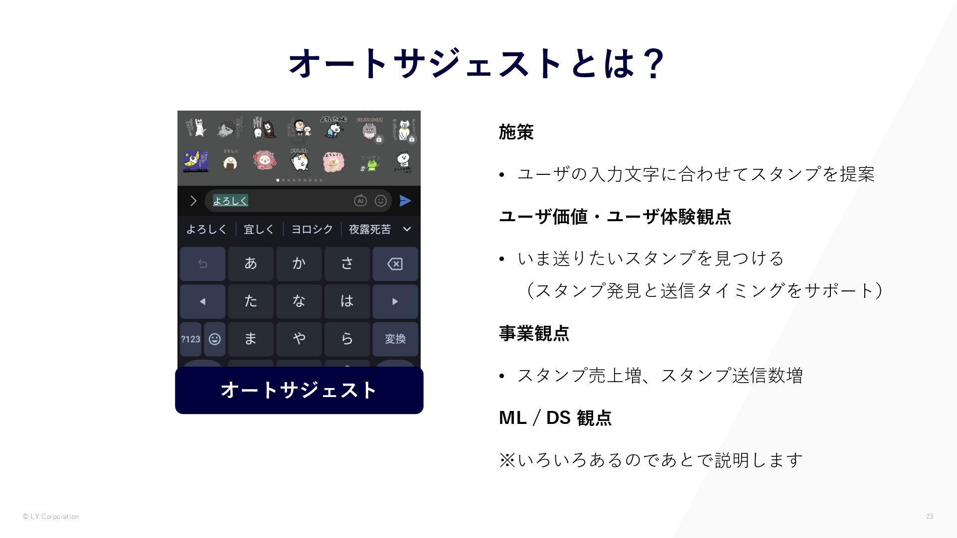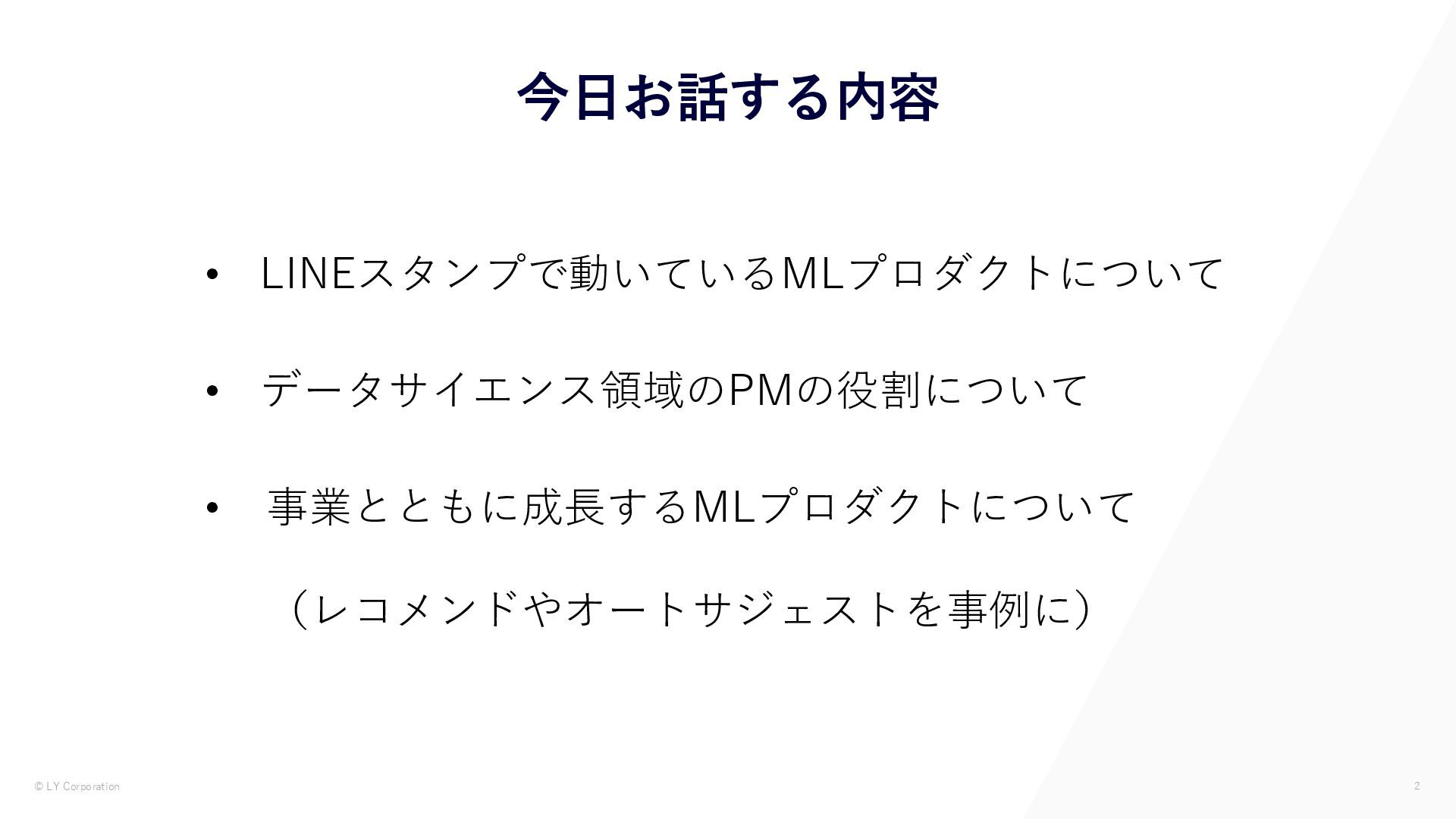 LINEヤフー株式会社のLINEスタンプ事業における、レコメンドやオートサジェストといったML(機械学習)プロダクトの成長プロセスと、その裏側にあるML PMの役割について取り上げます。