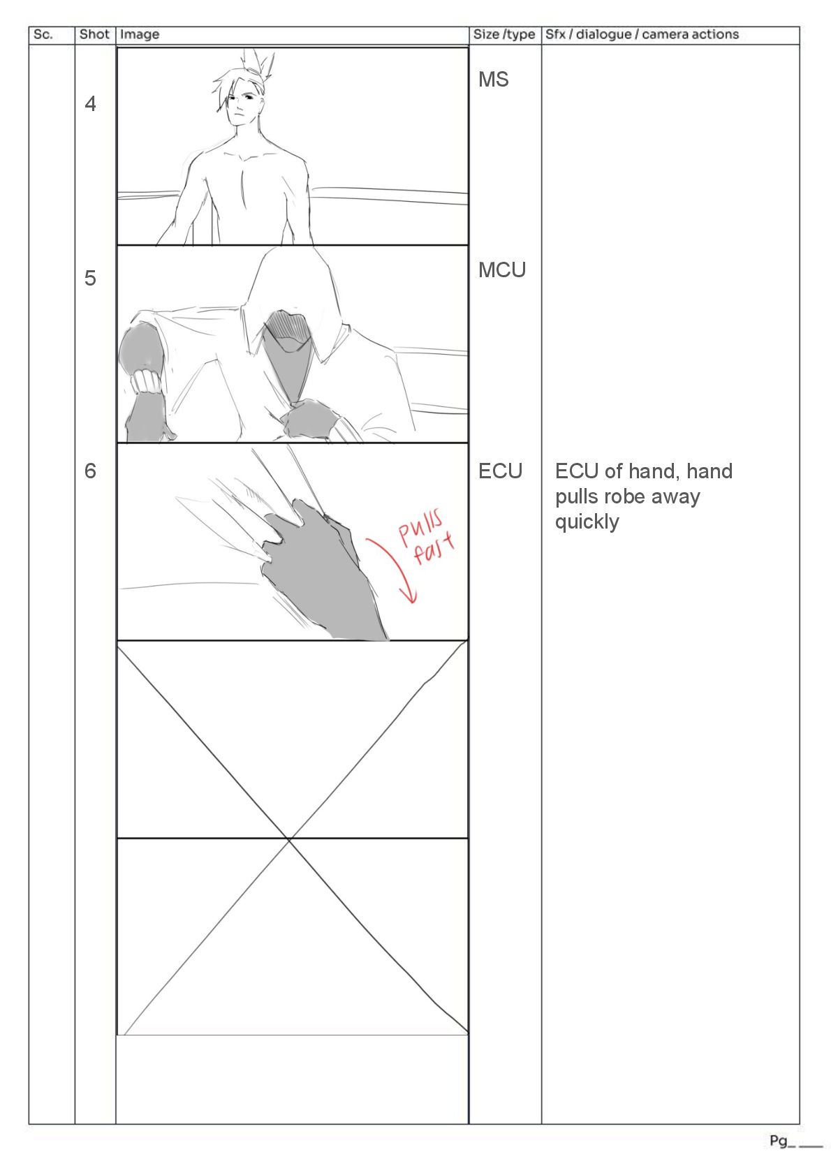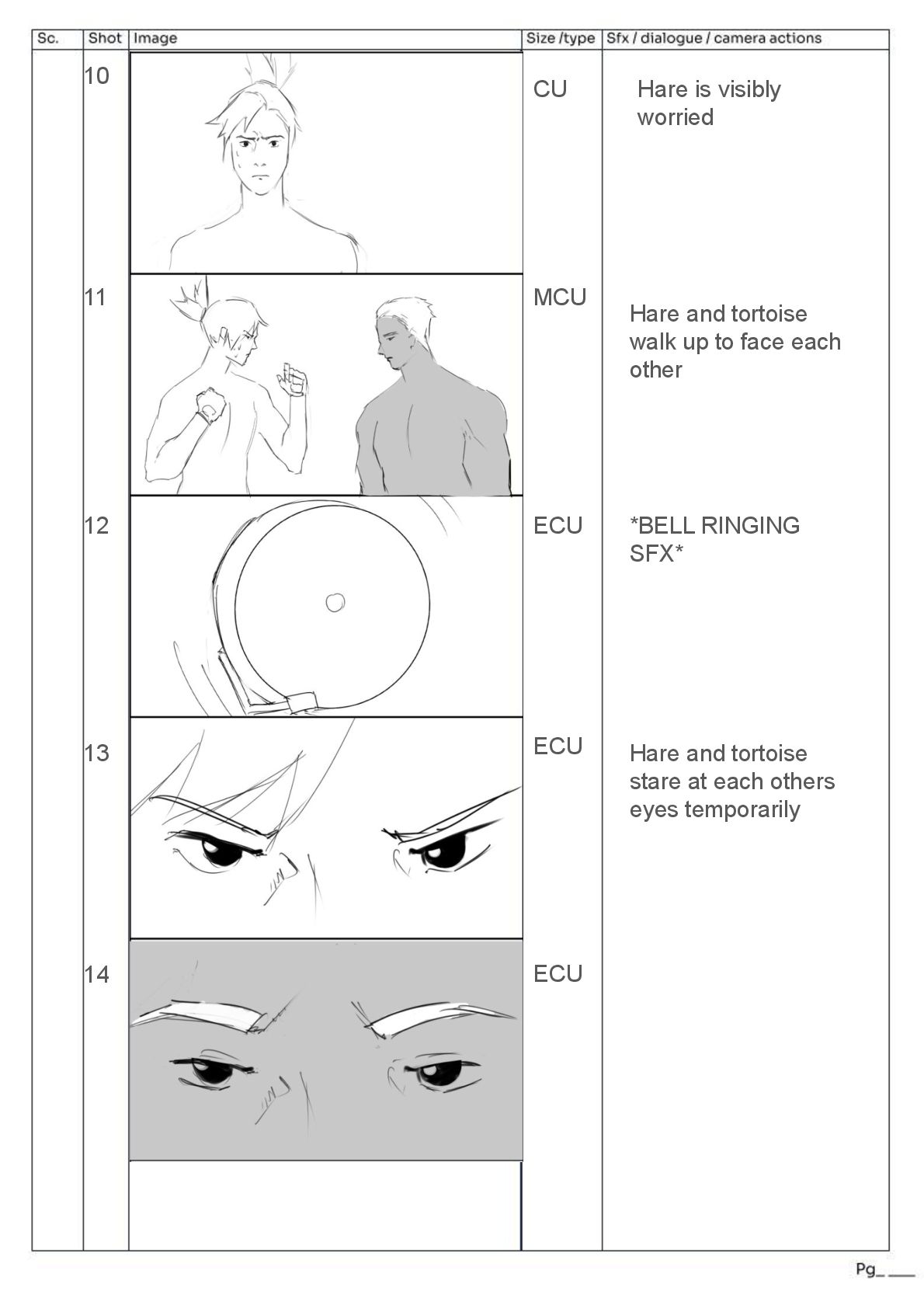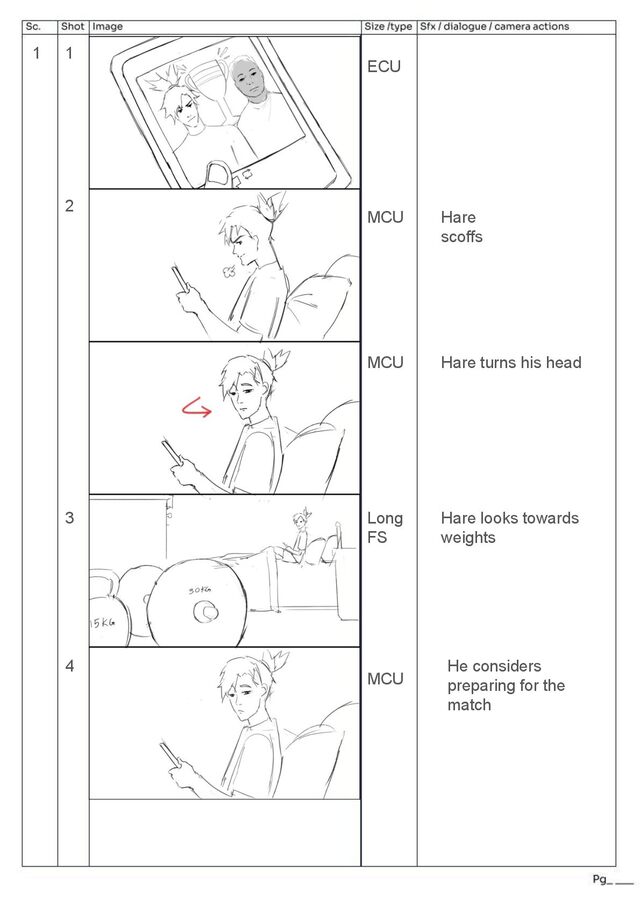 pans ECU of hand, hand pulls robe away quickly upwards from a low angle → indication of power Over the shoulder view of tortoise removing arm weight *SFX LOUD THUMP* Fast zoom to next frame of hare’s face