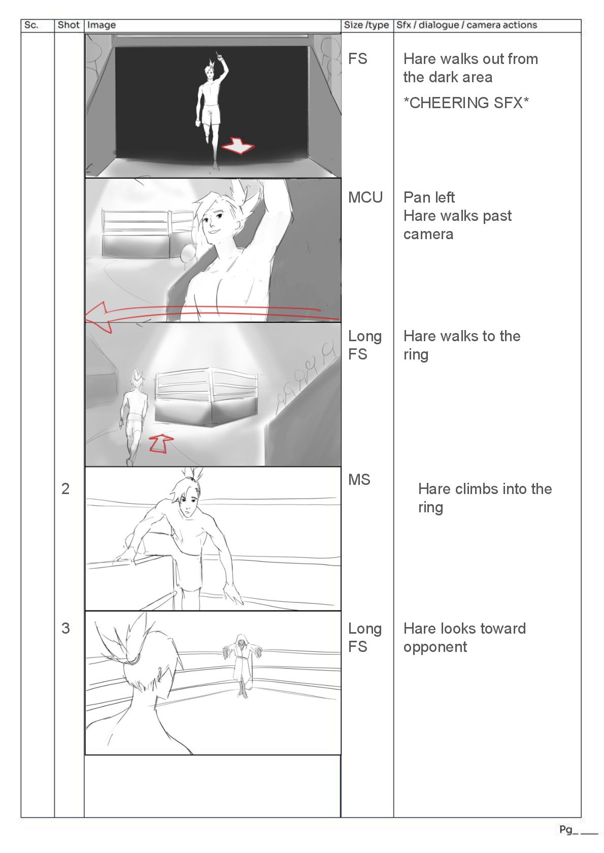 walks out from the dark area Pan left Hare walks past camera Hare walks to the ring Hare climbs into the ring Hare looks toward opponent *CHEERING SFX*