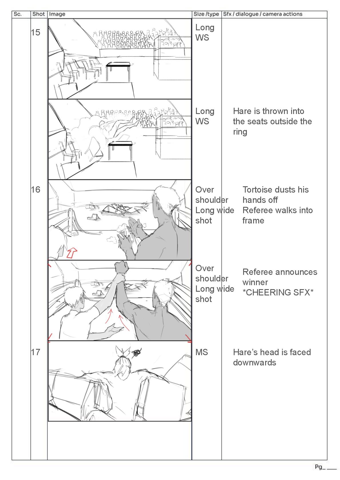 shoulder Long wide shot MS 15 16 17 Hare is thrown into the seats outside the ring Tortoise dusts his hands off Referee walks into frame Referee announces winner *CHEERING SFX* Hare’s head is faced downwards