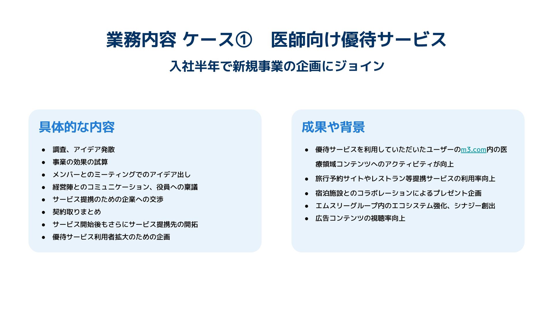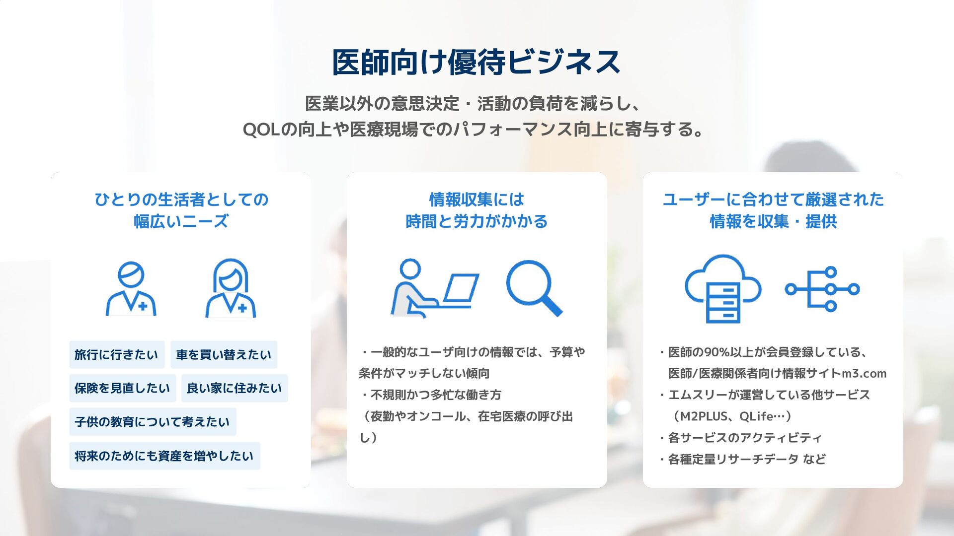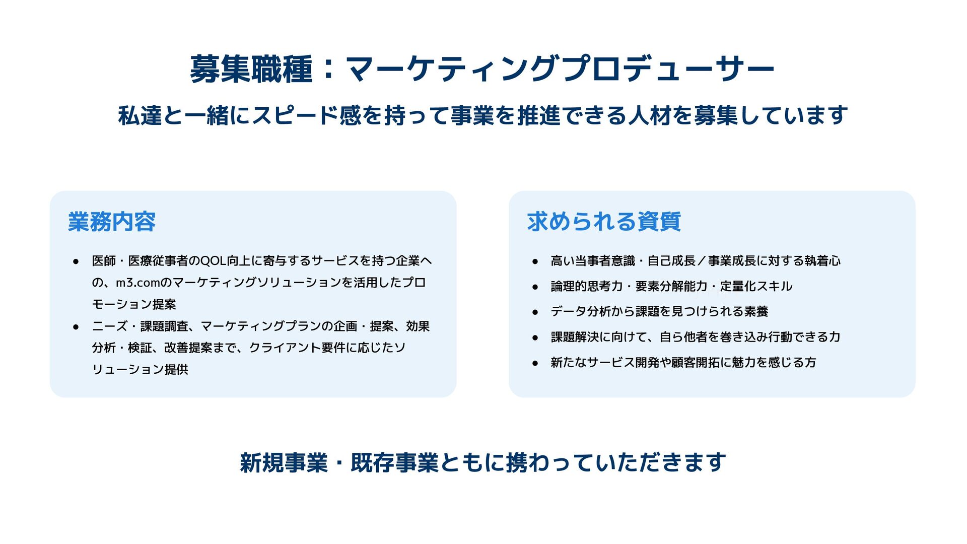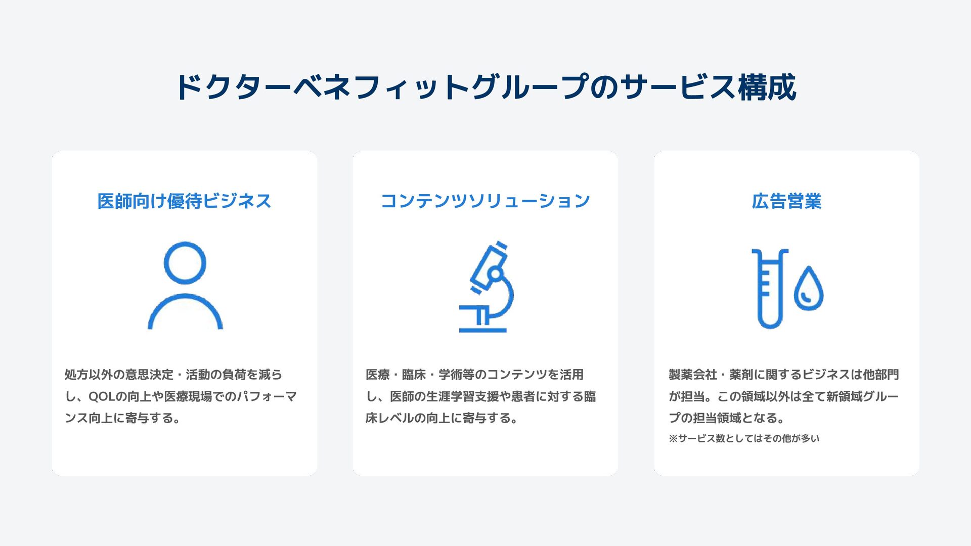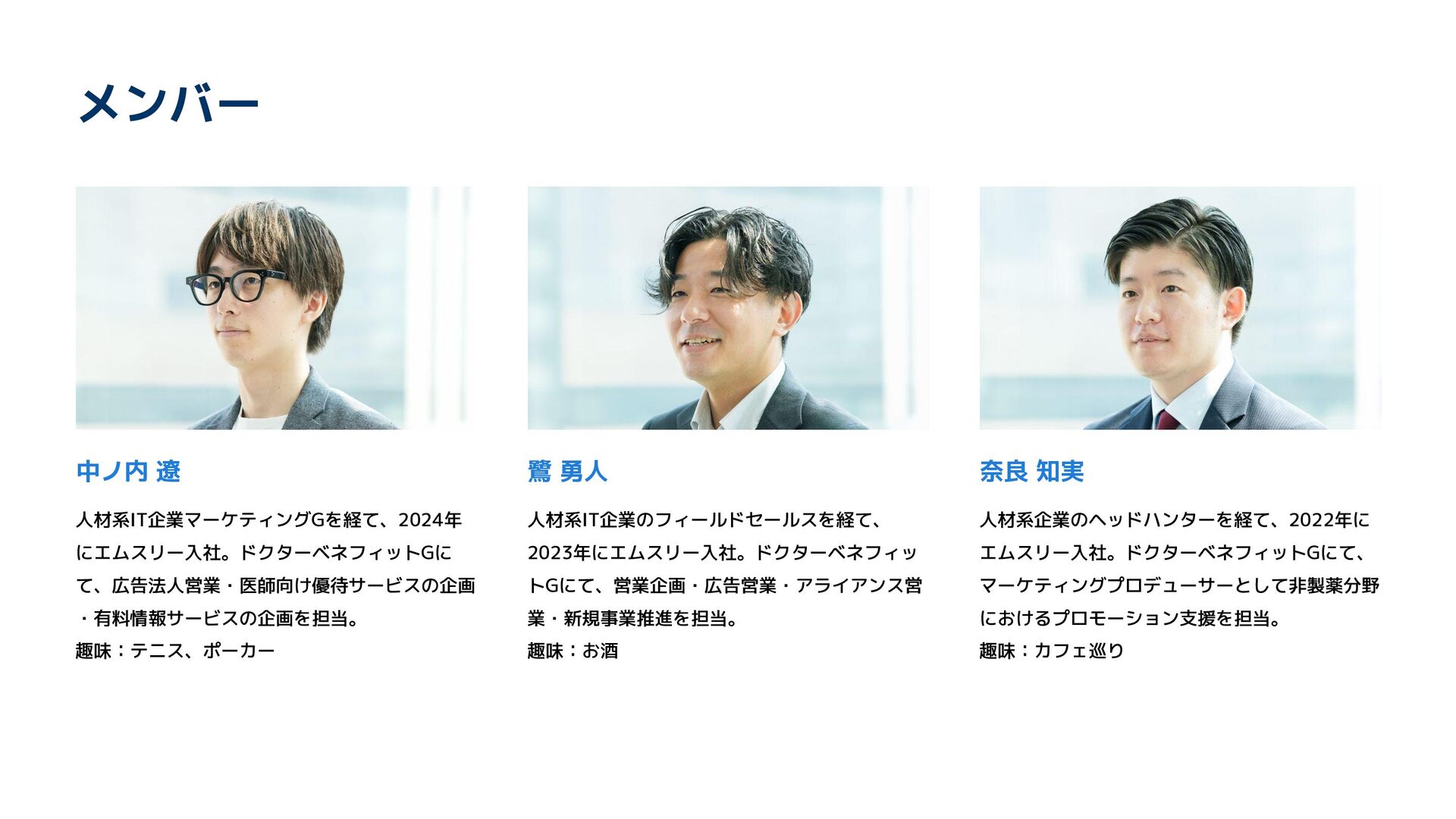 エムスリー・ドクターベネフィットGは、「医師の生活に役立つサービスや情報の開発・提供と、広告主への価値創出を通じて、エムスリーの売上・利益の向上に貢献する」をミッションに活動しています。 このスライドでは組織や仕事内容、環境、キャリアなどを説明します。