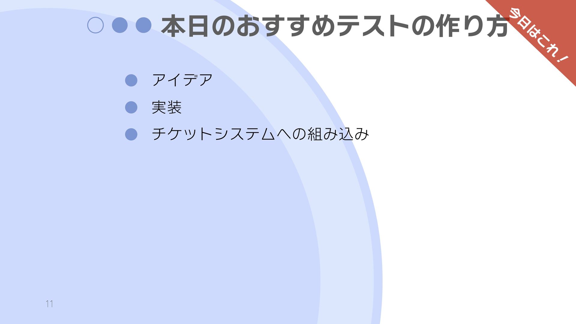 本日のおすすめテストの作り方 11 アイデア 実装 チケットシステムへの組み込み 今 日 は こ れ