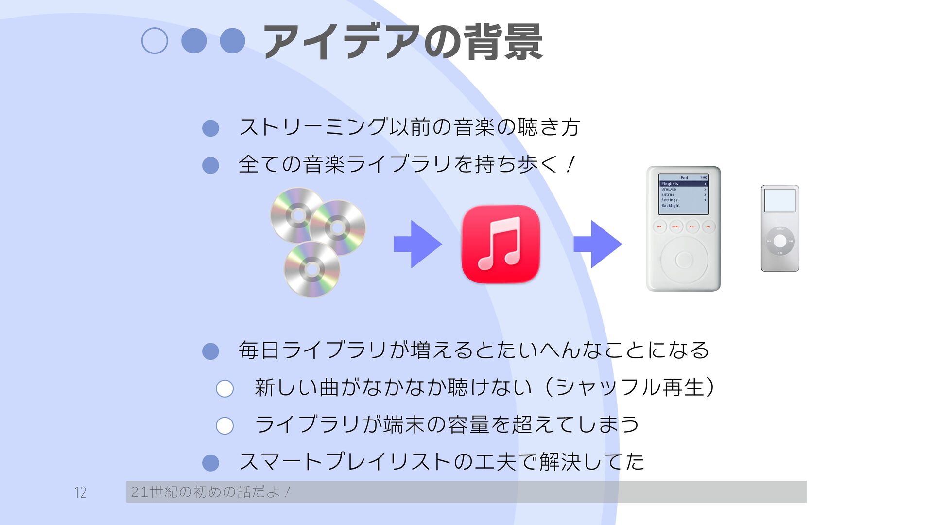 アイデアの背景 21世紀の初めの話だよ! 12 ストリーミング以前の音楽の聴き方 全ての音楽ライブラリを持ち歩く! 毎日ライブラリが増えるとたいへんなことになる 新しい曲がなかなか聴けない(シャッフル再生) ライブラリが端末の容量を超えてしまう スマートプレイリストの工夫で解決してた 💿