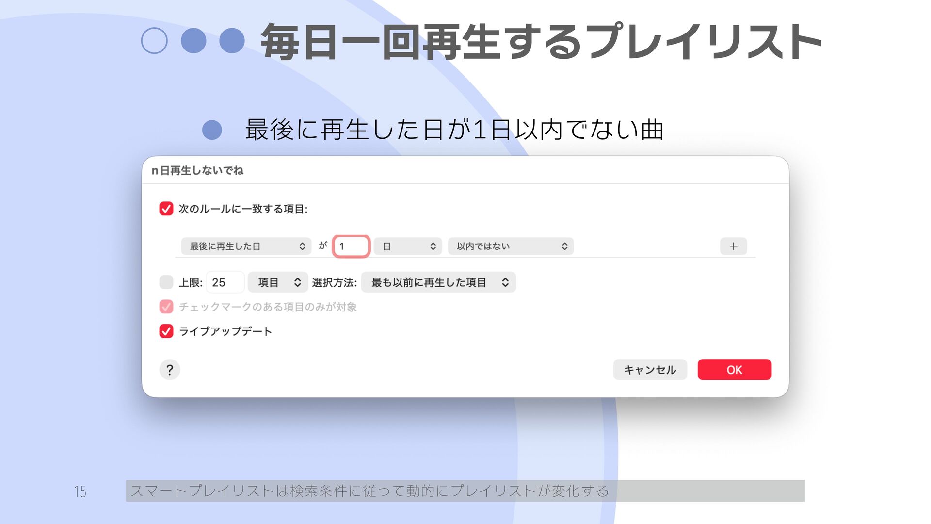 毎日一回再生するプレイリスト スマートプレイリストは検索条件に従って動的にプレイリストが変化する 15 最後に再生した日が1日以内でない曲