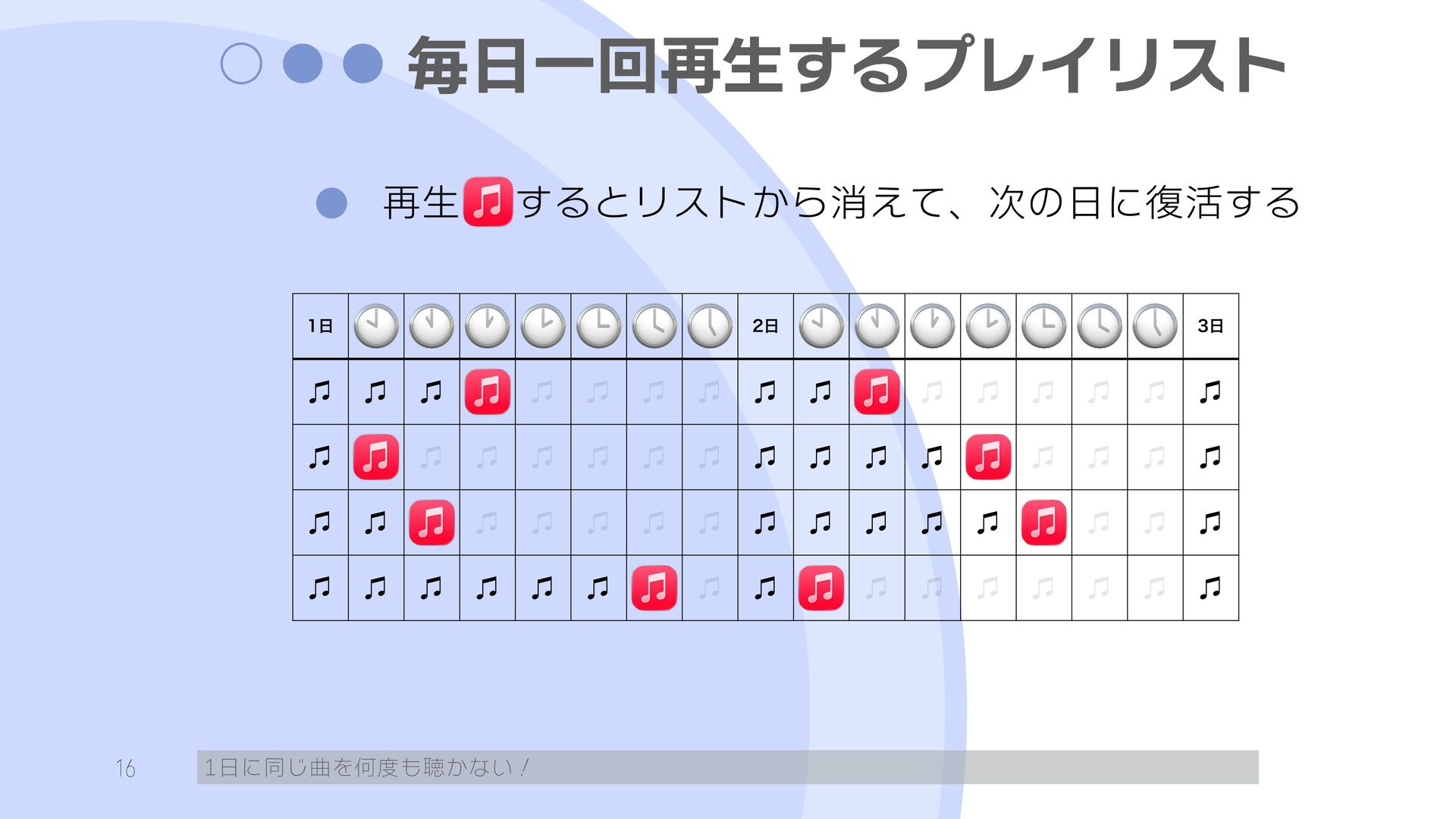 毎日一回再生するプレイリスト 1日に同じ曲を何度も聴かない! 16 再生 するとリストから消えて、次の日に復活する 🕙 🕚 🕐 🕑