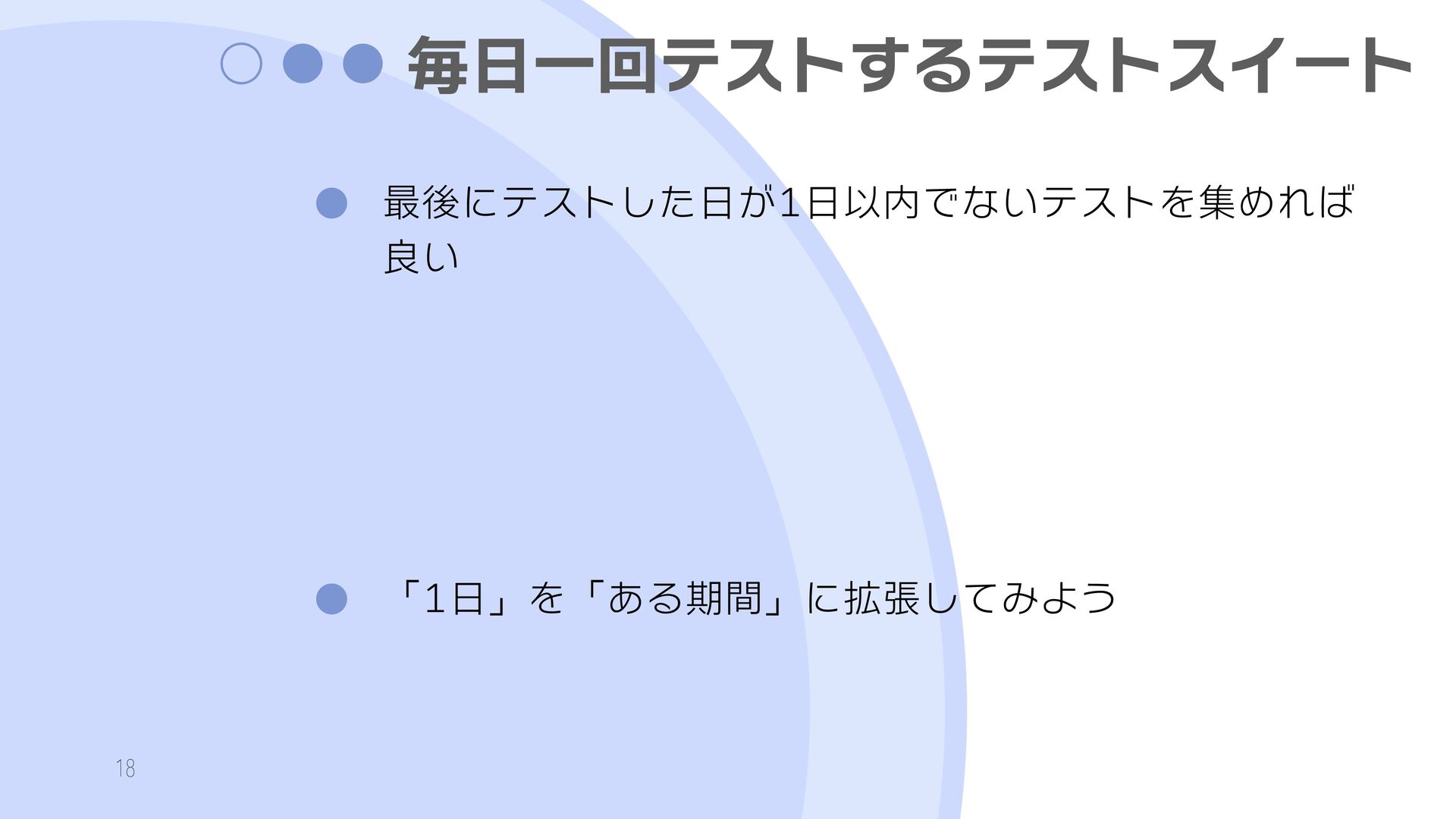 毎日一回テストするテストスイート 18 最後にテストした日が1日以内でないテストを集めれば 良い 「1日」を「ある期間」に拡張してみよう