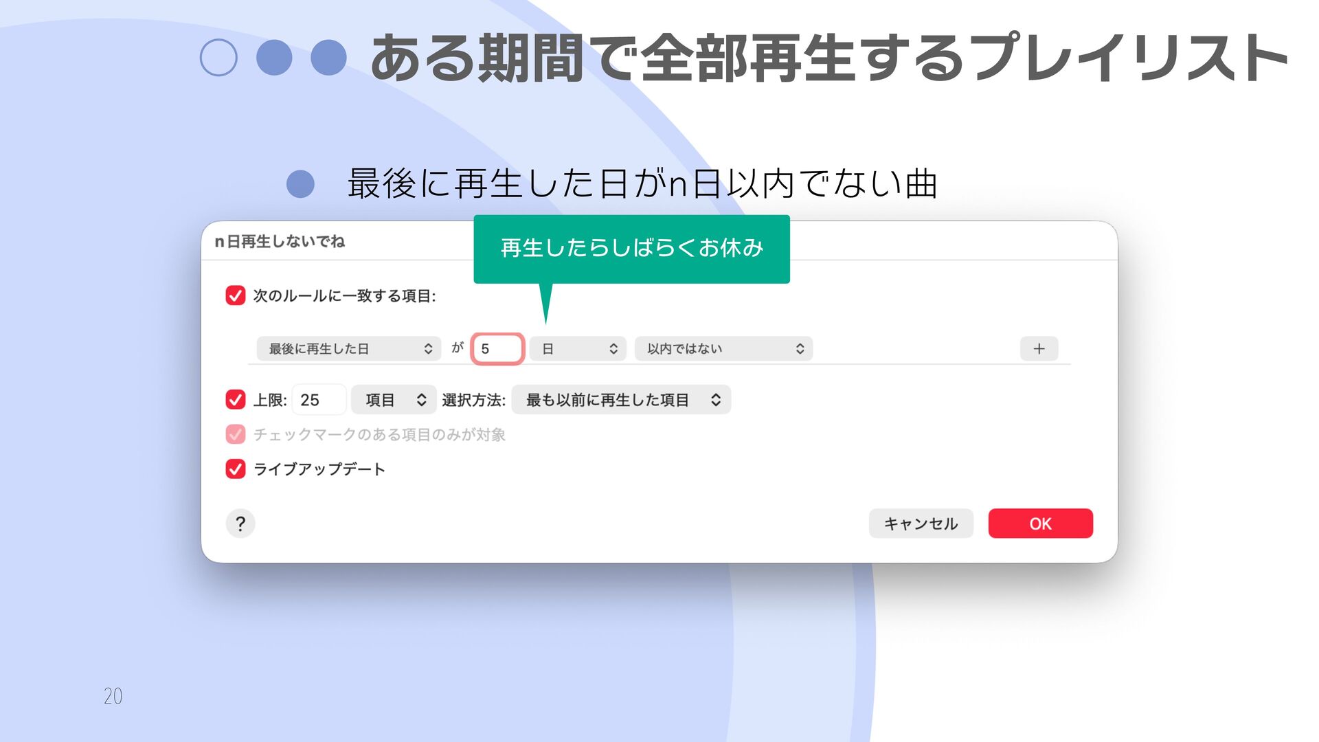 ある期間で全部再生するプレイリスト 20 最後に再生した日がn日以内でない曲 再生したらしばらくお休み