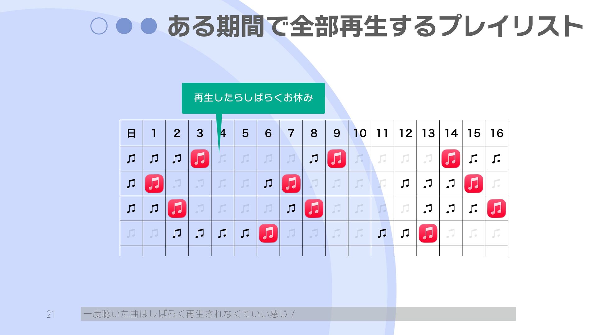 ある期間で全部再生するプレイリスト 一度聴いた曲はしばらく再生されなくていい感じ! 21