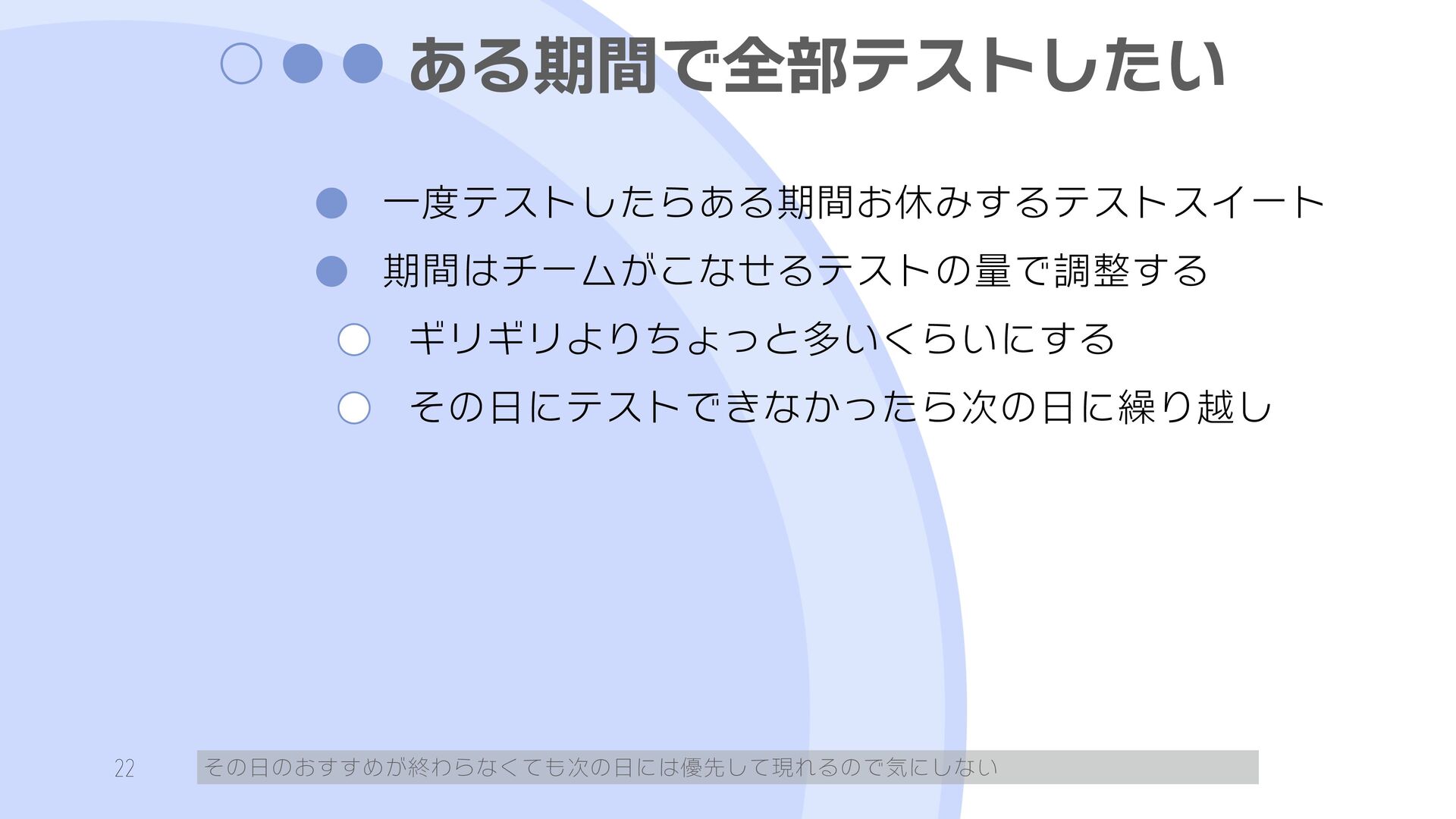 ある期間で全部テストしたい その日のおすすめが終わらなくても次の日には優先して現れるので気にしない 22 一度テストしたらある期間お休みするテストスイート 期間はチームがこなせるテストの量で調整する ギリギリよりちょっと多いくらいにする その日にテストできなかったら次の日に繰り越し