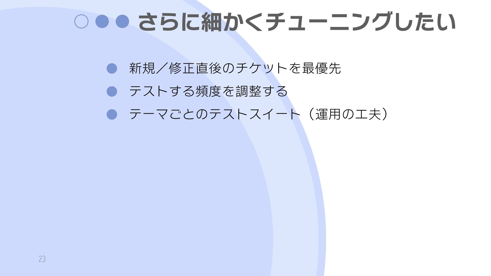 さらに細かくチューニングしたい 23 新規/修正直後のチケットを最優先 テストする頻度を調整する テーマごとのテストスイート(運用の工夫)