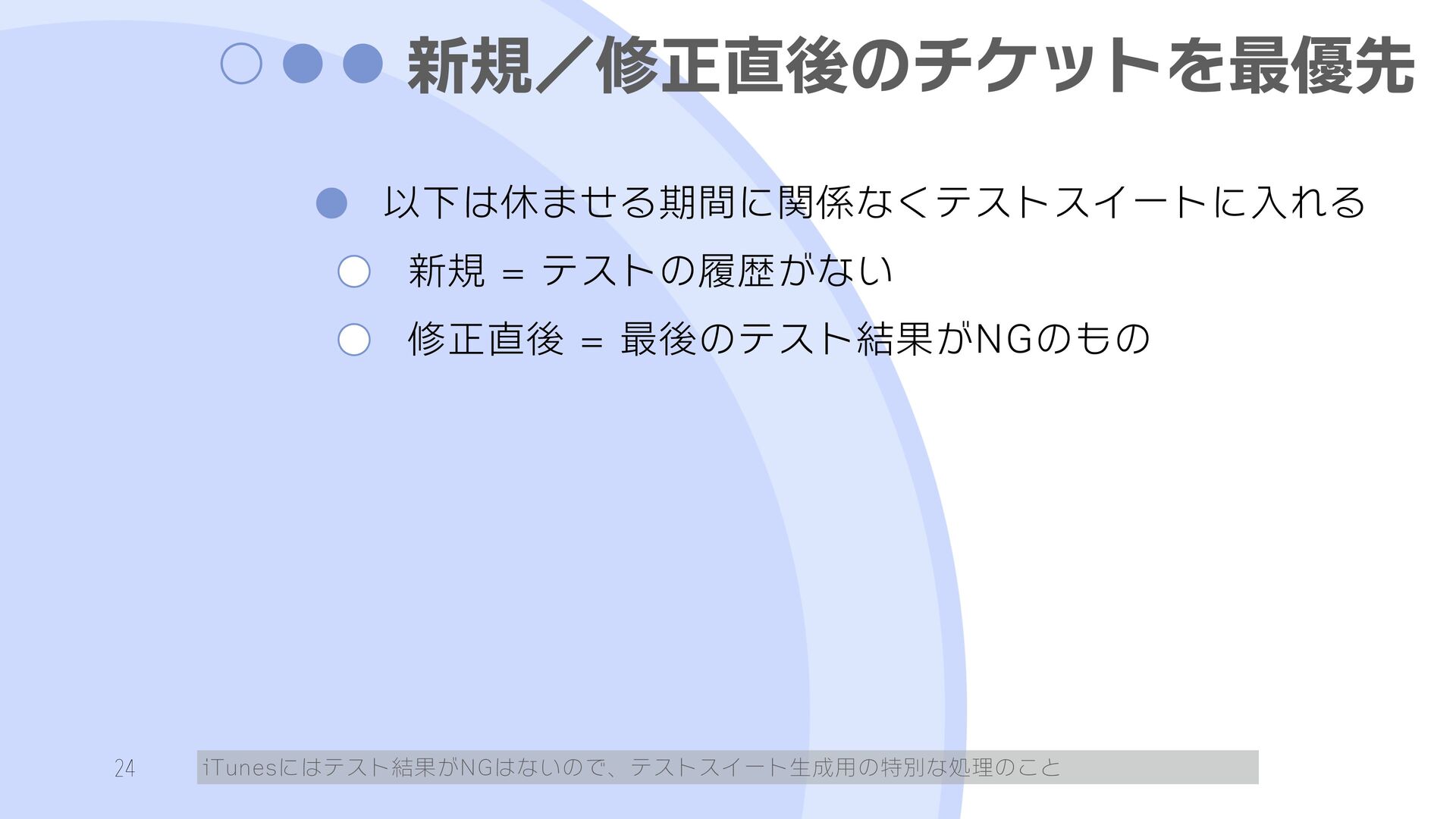 新規/修正直後のチケットを最優先 iTunesにはテスト結果がNGはないので、テストスイート生成用の特別な処理のこと 24 以下は休ませる期間に関係なくテストスイートに入れる 新規 = テストの履歴がない 修正直後 = 最後のテスト結果がNGのもの