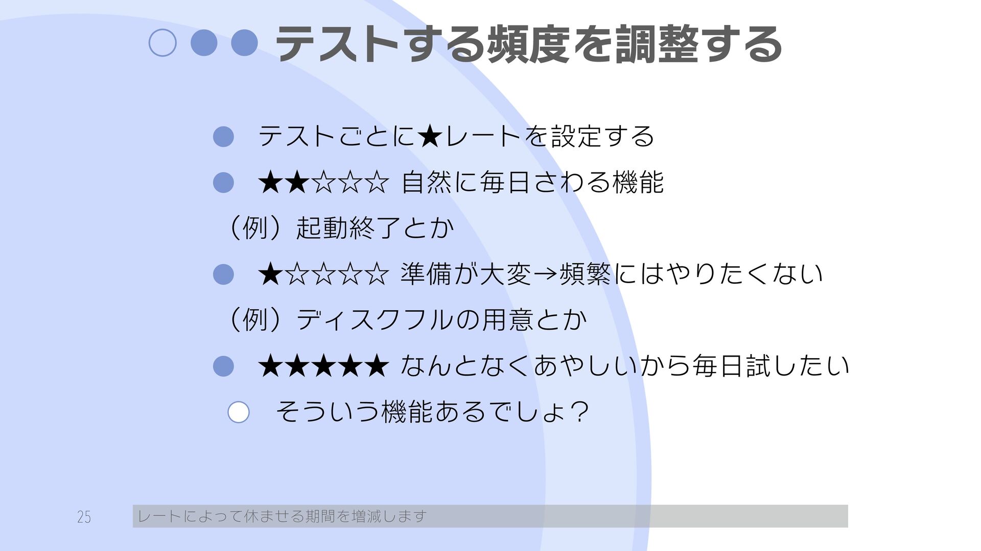 テストする頻度を調整する レートによって休ませる期間を増減します 25 テストごとに★レートを設定する ★★☆☆☆ 自然に毎日さわる機能 (例)起動終了とか ★☆☆☆☆ 準備が大変→頻繁にはやりたくない (例)ディスクフルの用意とか