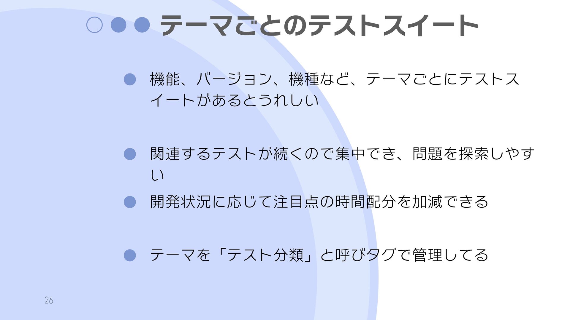 テーマごとのテストスイート 26 機能、バージョン、機種など、テーマごとにテストス イートがあるとうれしい 関連するテストが続くので集中でき、問題を探索しやす い 開発状況に応じて注目点の時間配分を加減できる テーマを「テスト分類」と呼びタグで管理してる