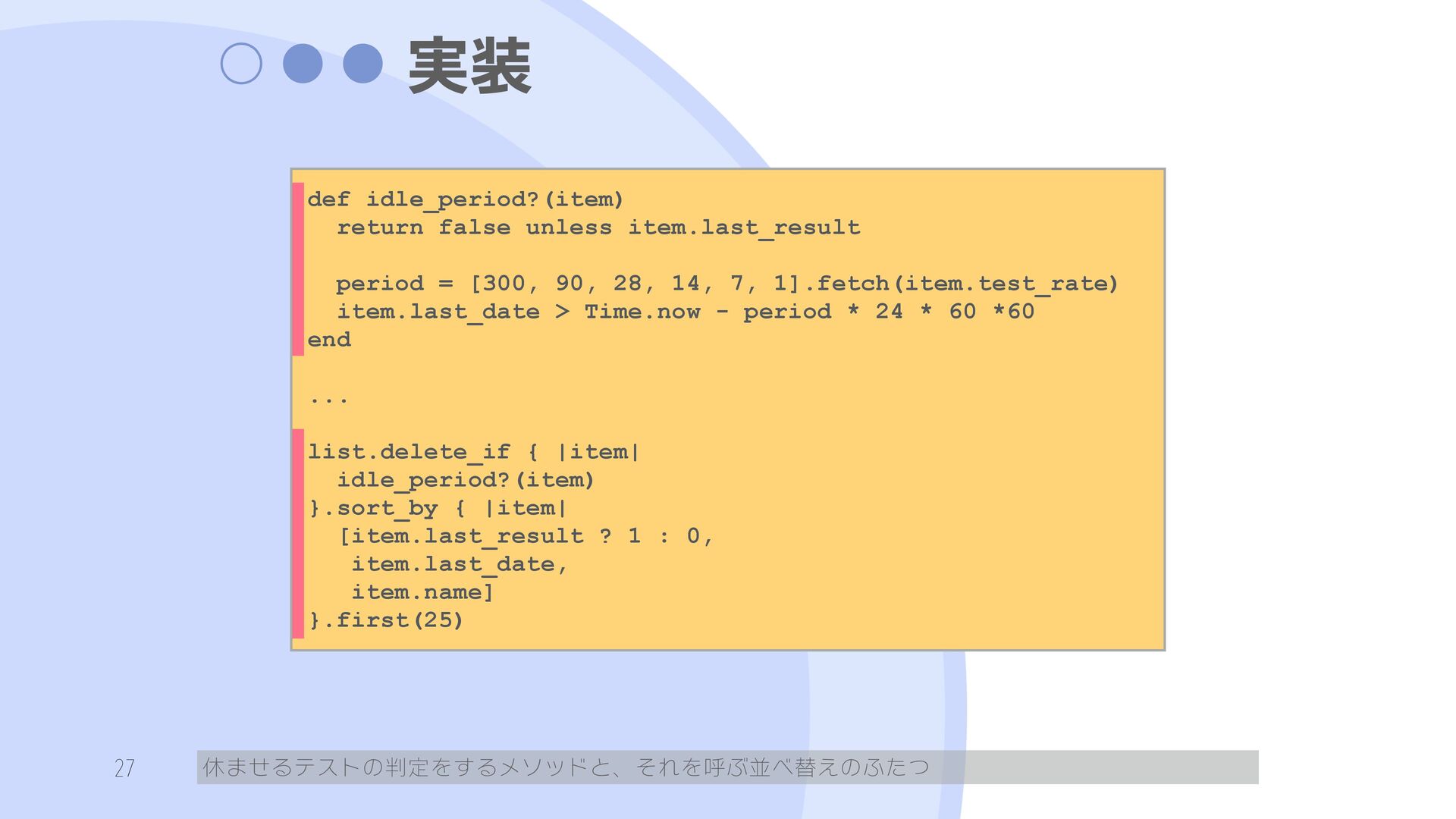 実装 休ませるテストの判定をするメソッドと、それを呼ぶ並べ替えのふたつ 27 休ませるテストの判定 並べ替え def idle_period?(item) return false unless