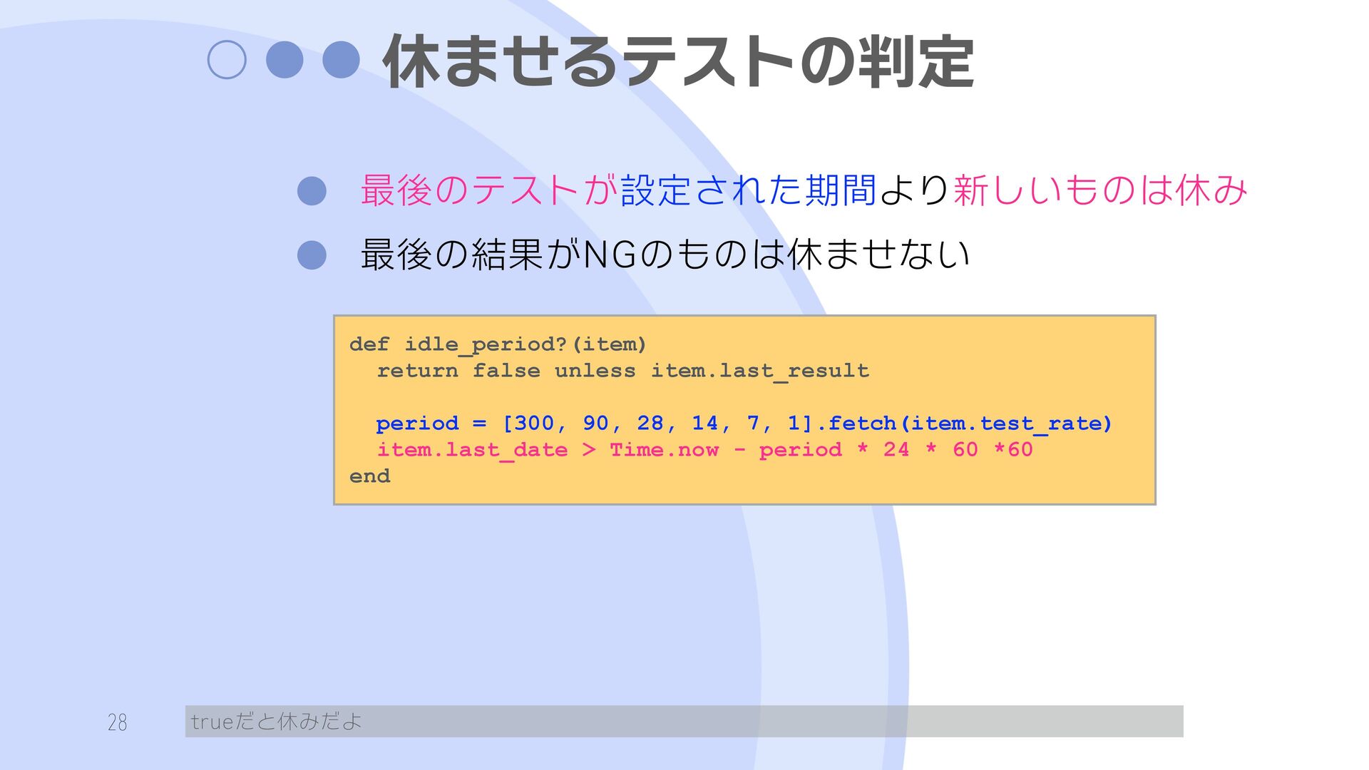 休ませるテストの判定 trueだと休みだよ 28 最後のテストが設定された期間より新しいものは休み 最後の結果がNGのものは休ませない def idle_period?(item) return false unless