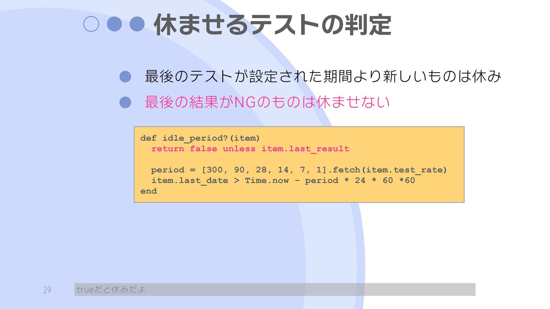 休ませるテストの判定 trueだと休みだよ 29 最後のテストが設定された期間より新しいものは休み 最後の結果がNGのものは休ませない def idle_period?(item) return false unless