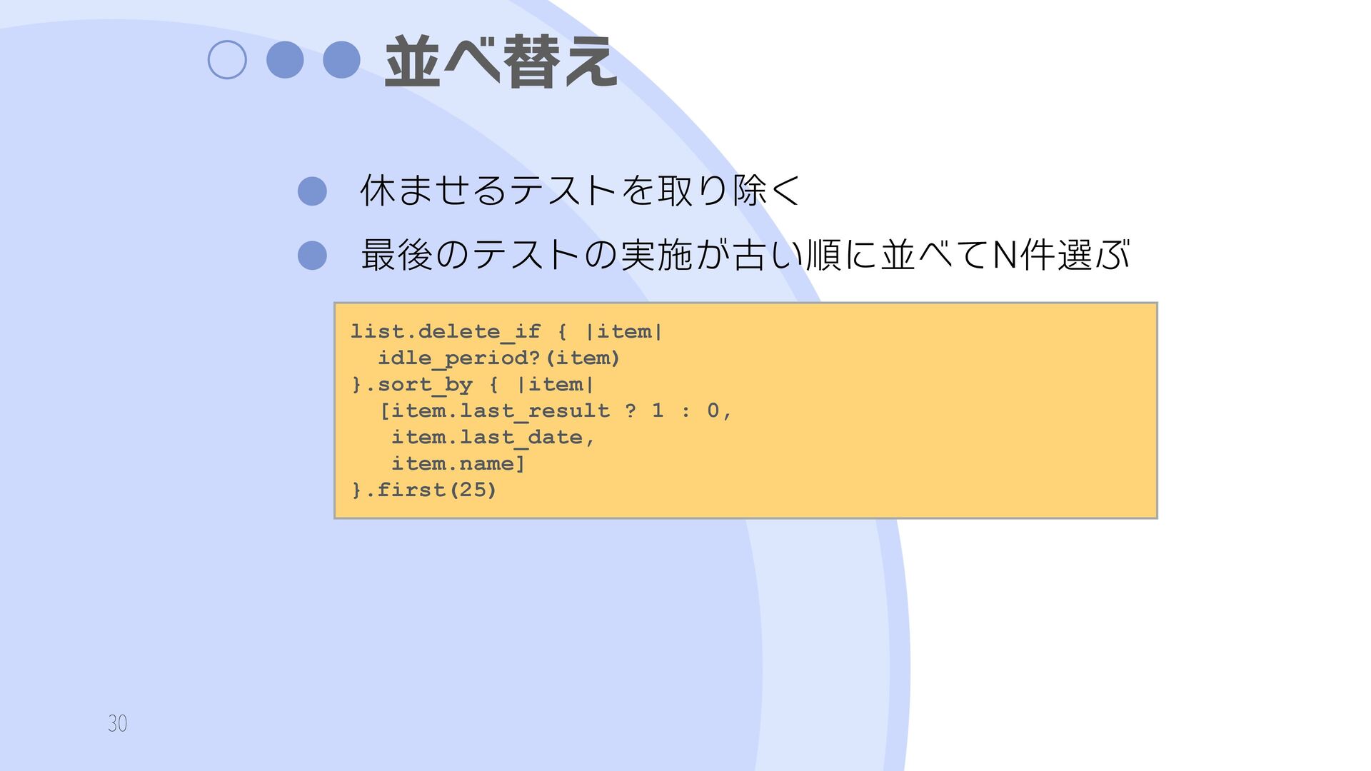 並べ替え 30 休ませるテストを取り除く 最後のテストの実施が古い順に並べてN件選ぶ list.delete_if { |item| idle_period?(item) }.sort_by {