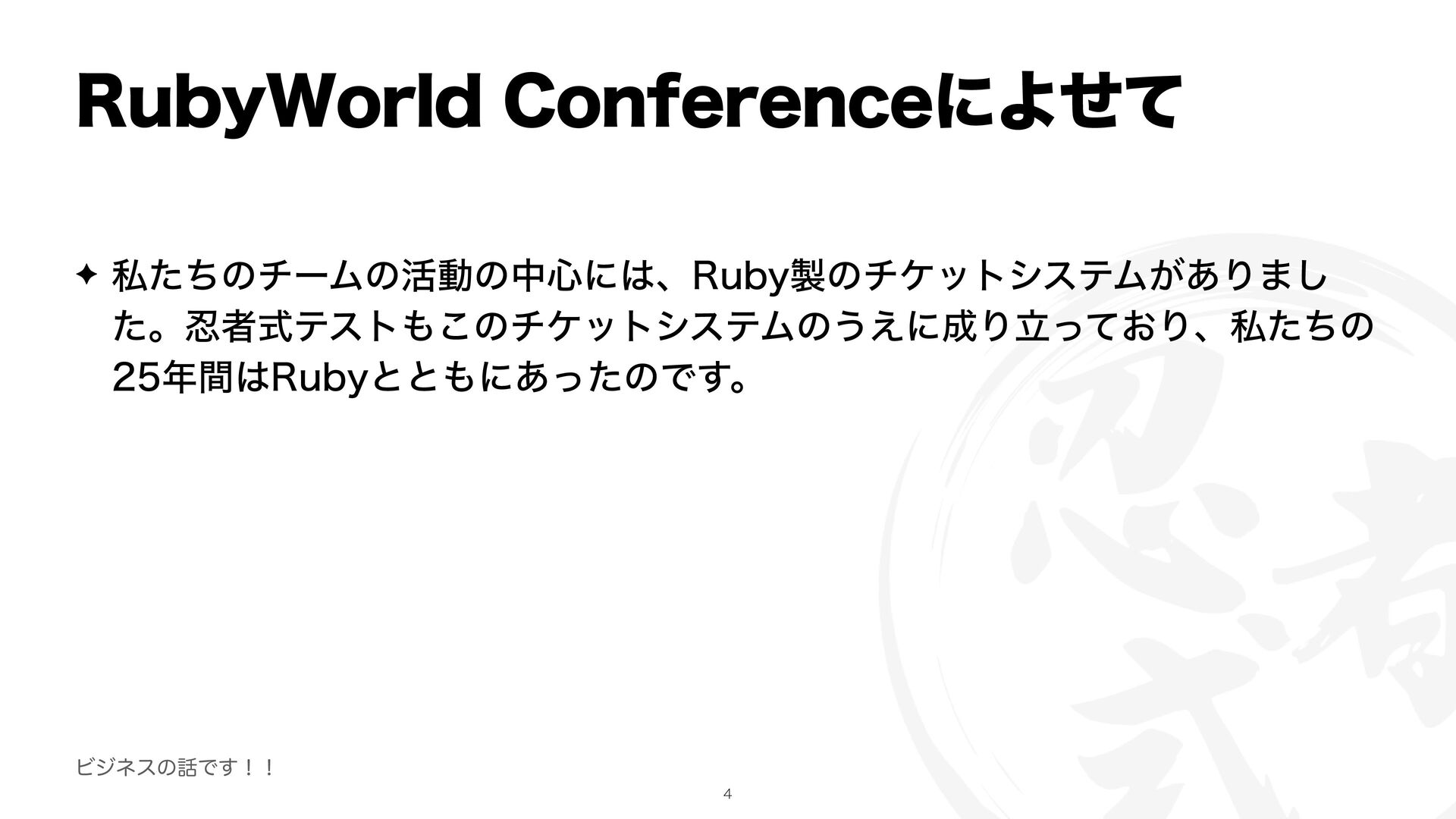 3VCZ8PSME$POGFSFODFʹΑͤͯ ✦ ࢲͨͪͷνʔϜͷ׆ಈͷத৺ʹɺ3VCZͷνέοτγεςϜ͕͋Γ·͠ ͨɻऀࣜςετ͜ͷνέοτγεςϜͷ͏͑ʹΓཱ͓ͬͯΓɺࢲͨͪͷ ؒ3VCZͱͱʹ͋ͬͨͷͰ͢ɻ ϏδωεͷͰ͢ʂʂ