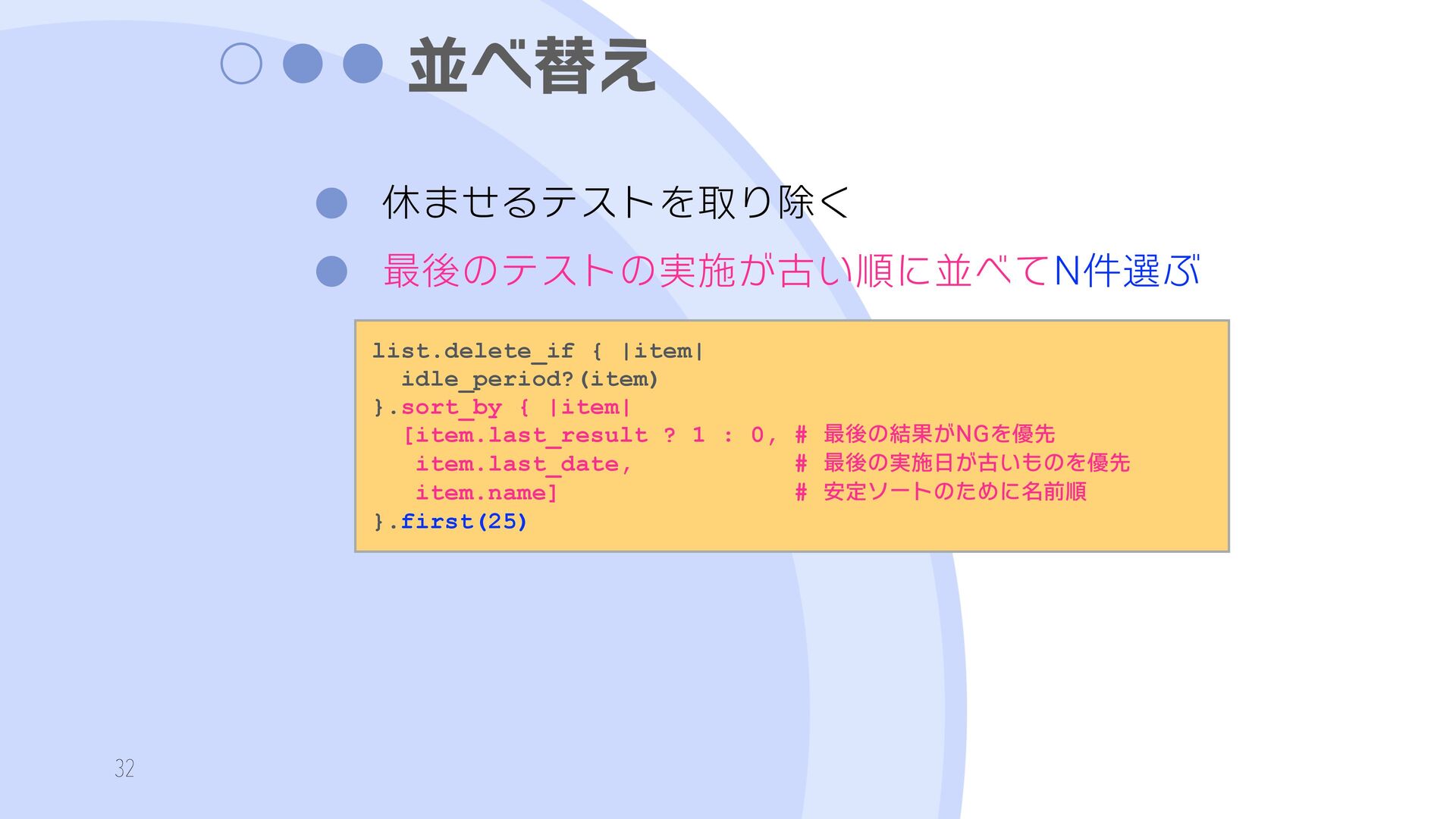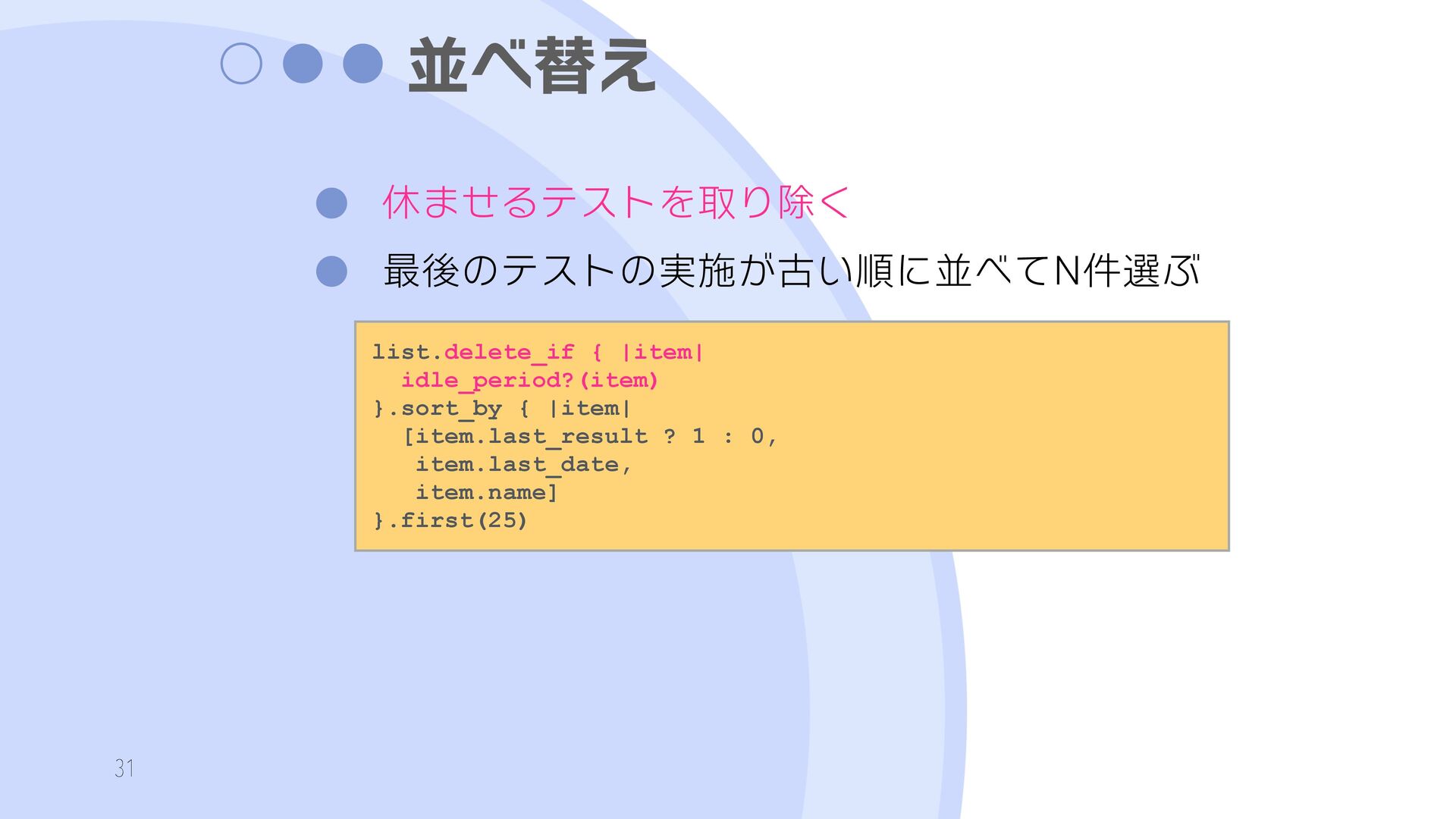 並べ替え 31 休ませるテストを取り除く 最後のテストの実施が古い順に並べてN件選ぶ list.delete_if { |item| idle_period?(item) }.sort_by {