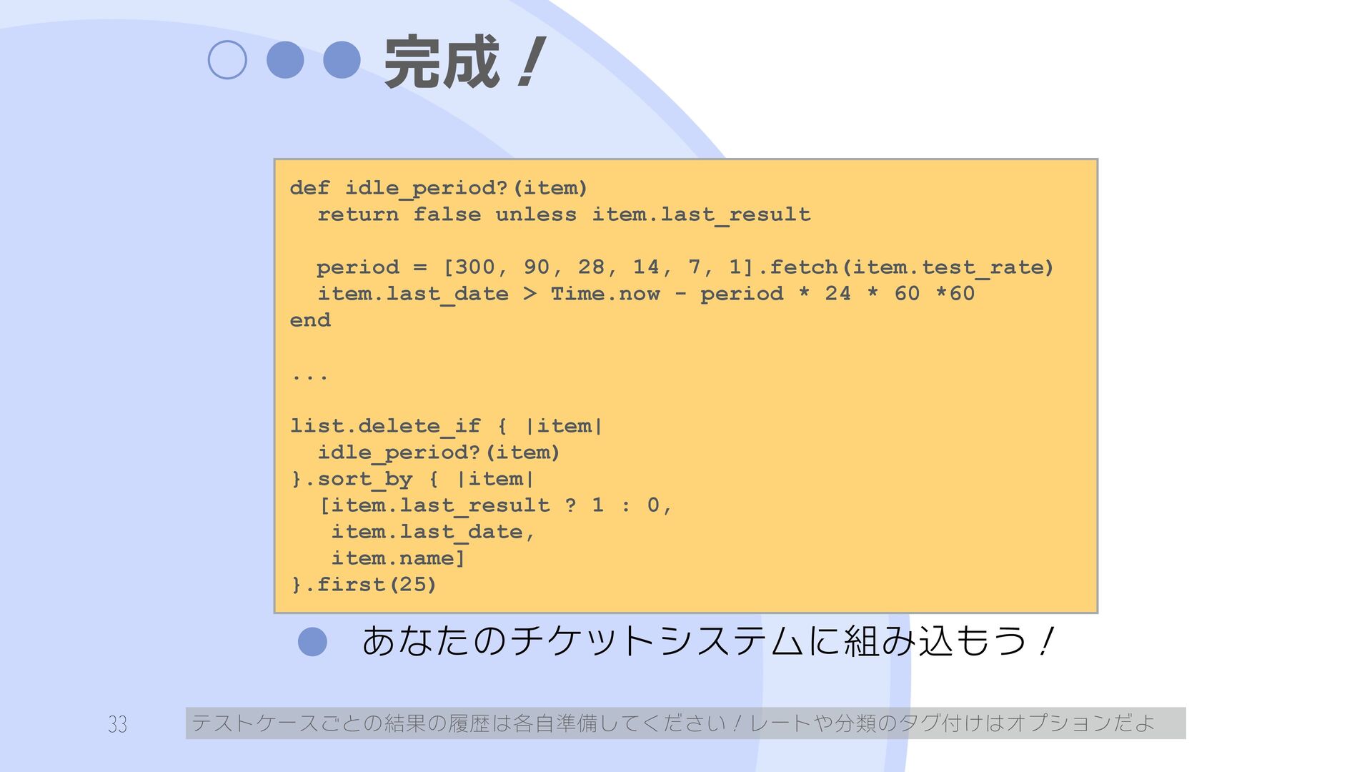 完成! テストケースごとの結果の履歴は各自準備してください!レートや分類のタグ付けはオプションだよ 33 あなたのチケットシステムに組み込もう! def idle_period?(item) return false unless item.last_result