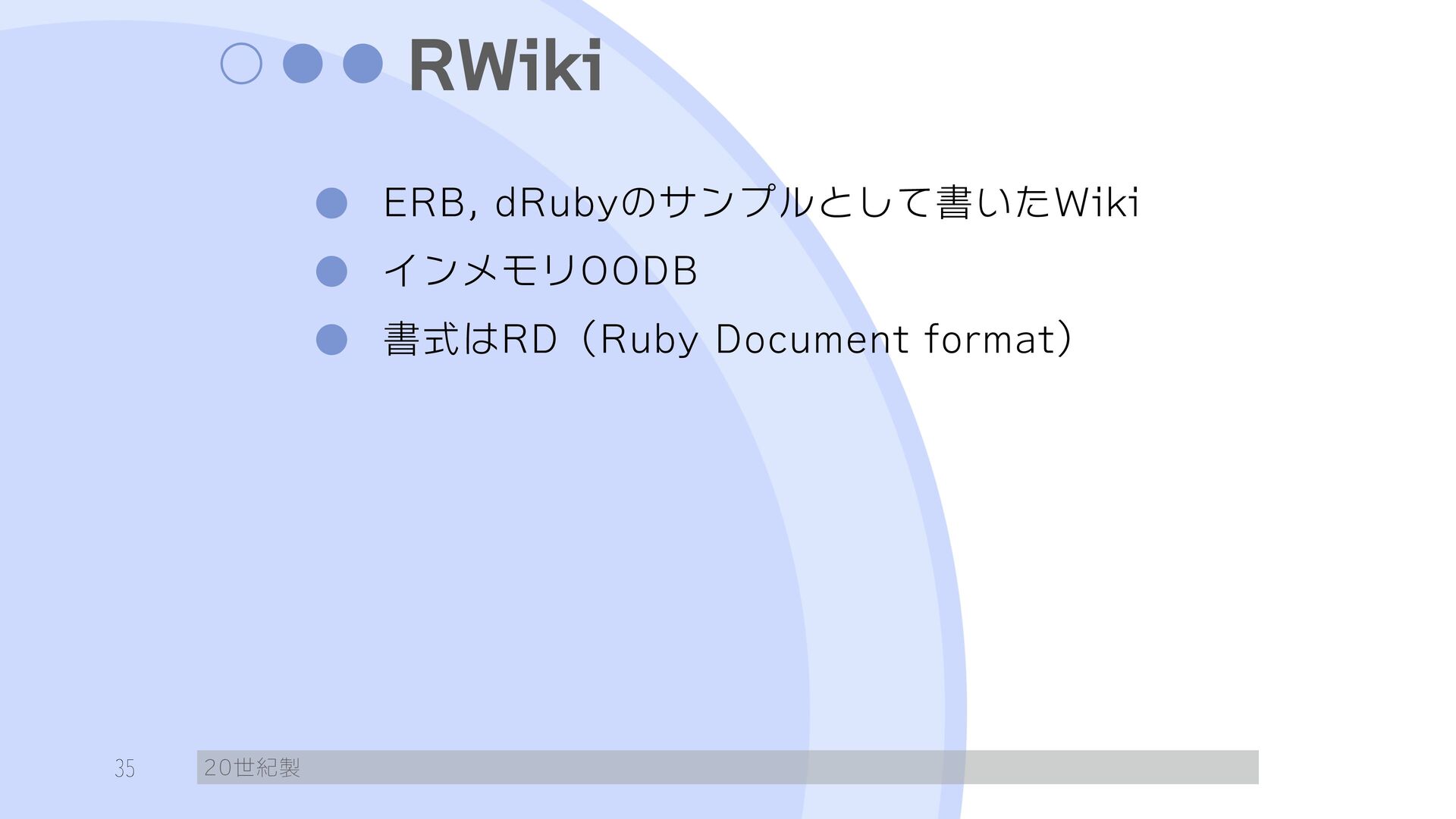 RWiki 20世紀製 35 ERB, dRubyのサンプルとして書いたWiki インメモリOODB 書式はRD(Ruby Document format)