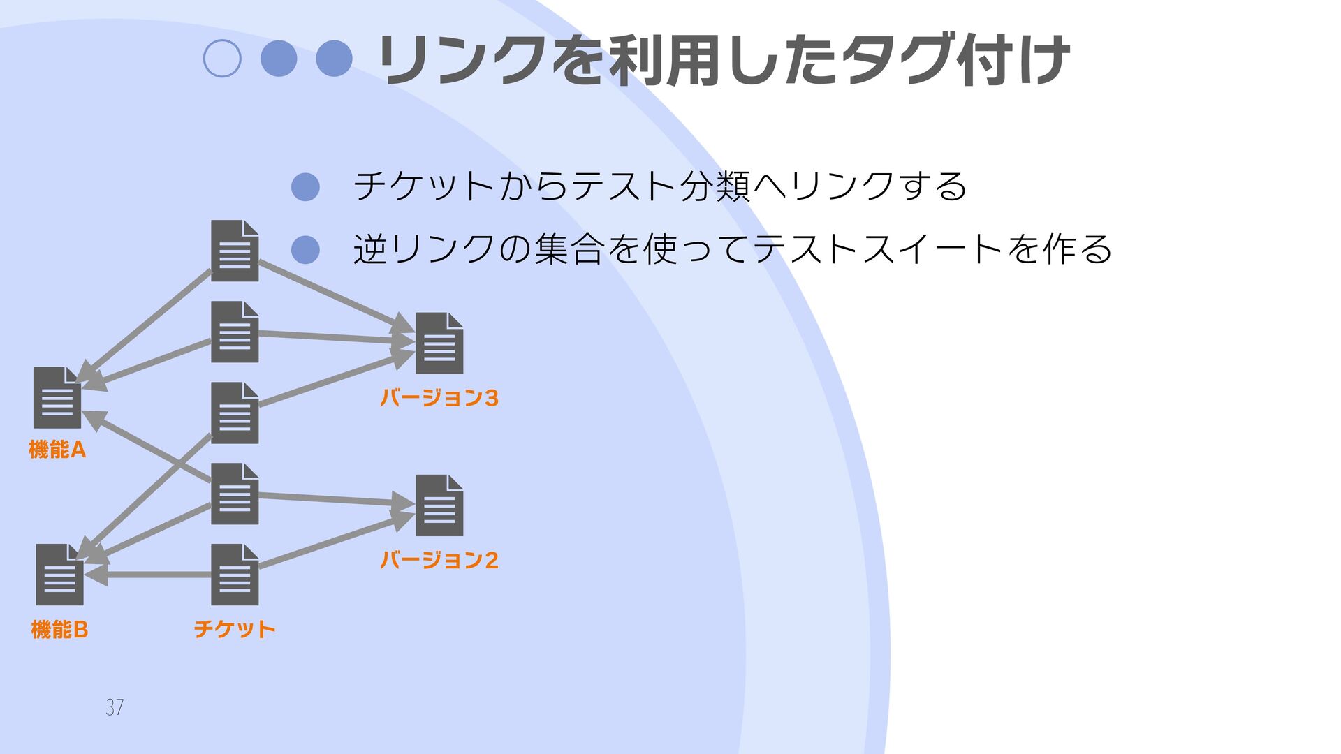 リンクを利用したタグ付け 37 チケットからテスト分類へリンクする 逆リンクの集合を使ってテストスイートを作る 機能A チケット 機能B バージョン2 バージョン3