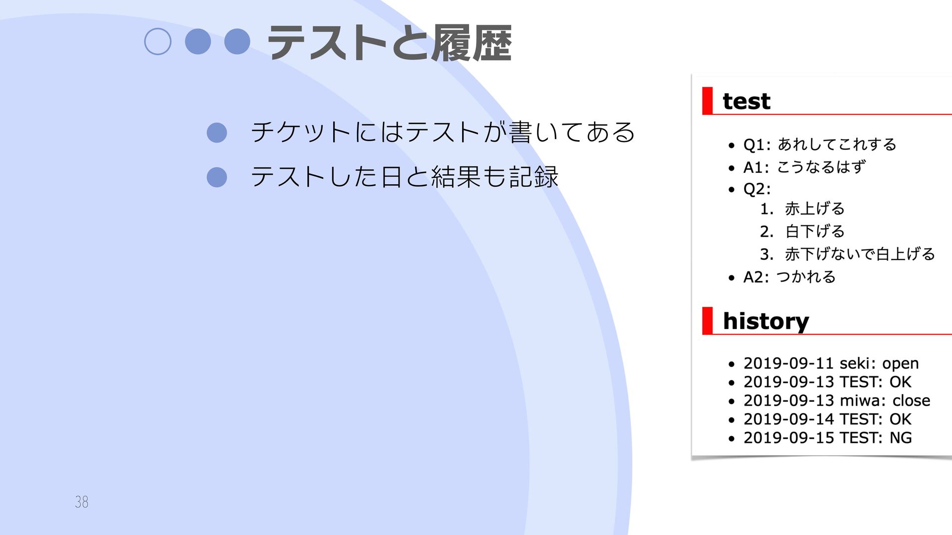 テストと履歴 38 チケットにはテストが書いてある テストした日と結果も記録