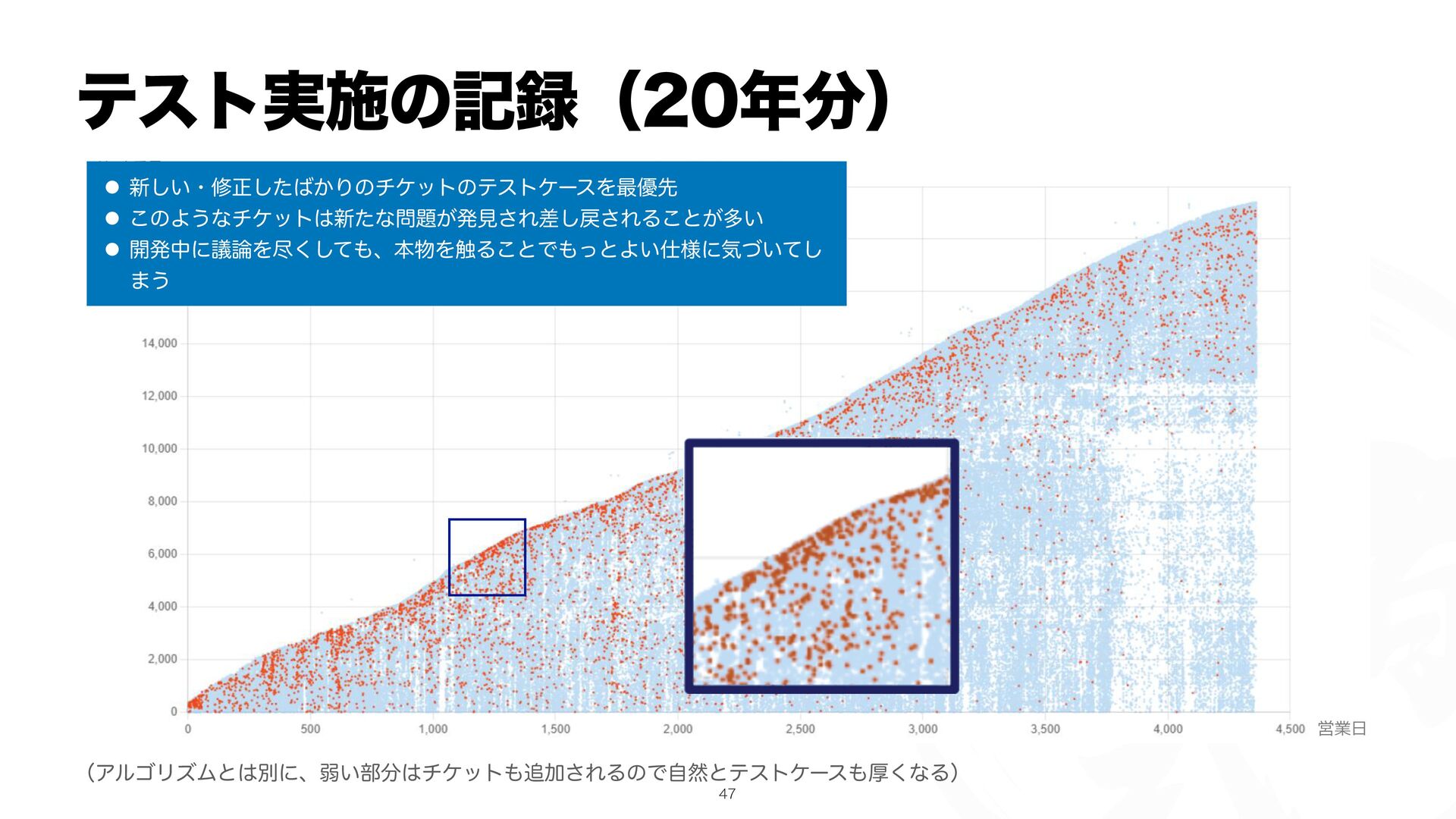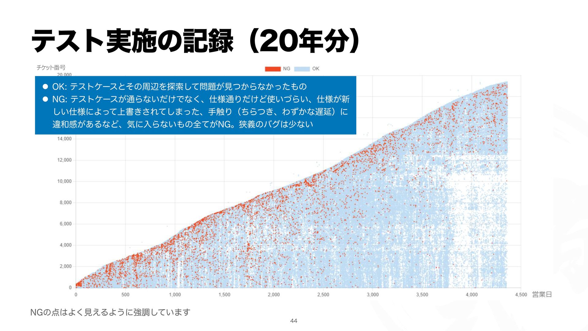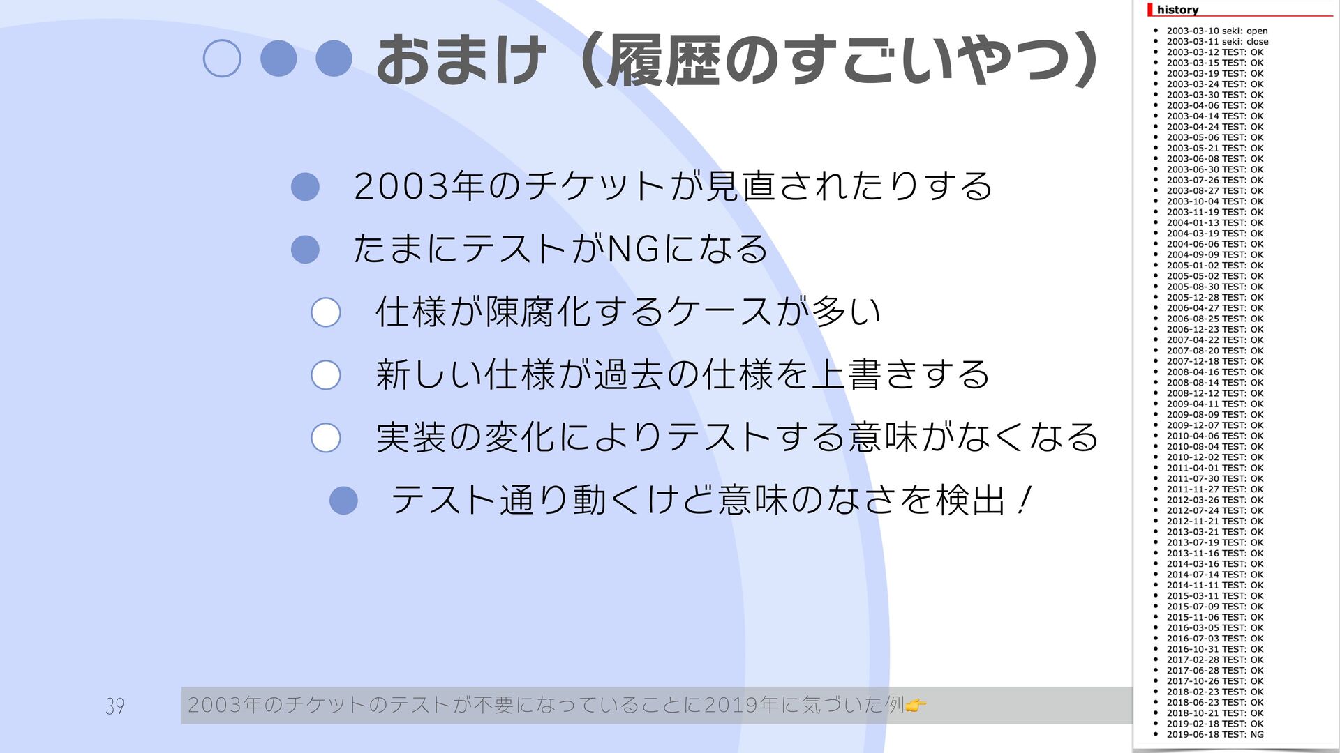 おまけ(履歴のすごいやつ) 2003年のチケットのテストが不要になっていることに2019年に気づいた例👉 39 2003年のチケットが見直されたりする たまにテストがNGになる 仕様が陳腐化するケースが多い 新しい仕様が過去の仕様を上書きする 実装の変化によりテストする意味がなくなる テスト通り動くけど意味のなさを検出!