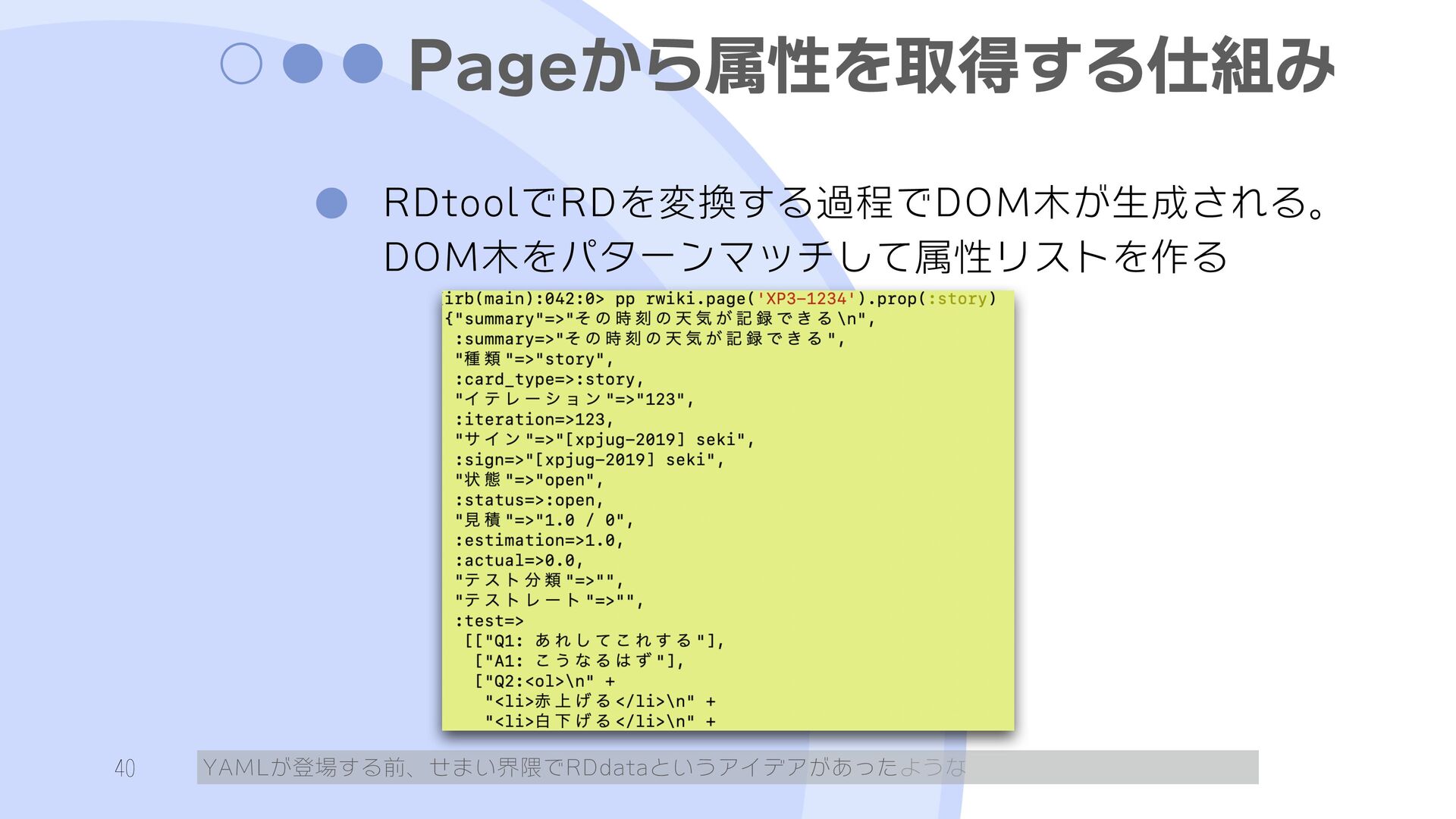 Pageから属性を取得する仕組み YAMLが登場する前、せまい界隈でRDdataというアイデアがあったような 40 RDtoolでRDを変換する過程でDOM木が生成される。 DOM木をパターンマッチして属性リストを作る