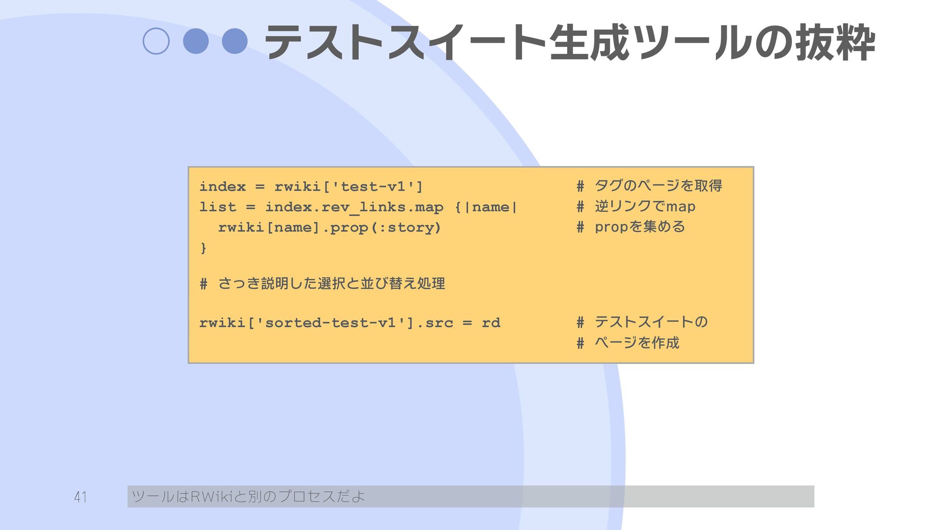 テストスイート生成ツールの抜粋 ツールはRWikiと別のプロセスだよ 41 index = rwiki['test-v1'] # タグのページを取得 list =