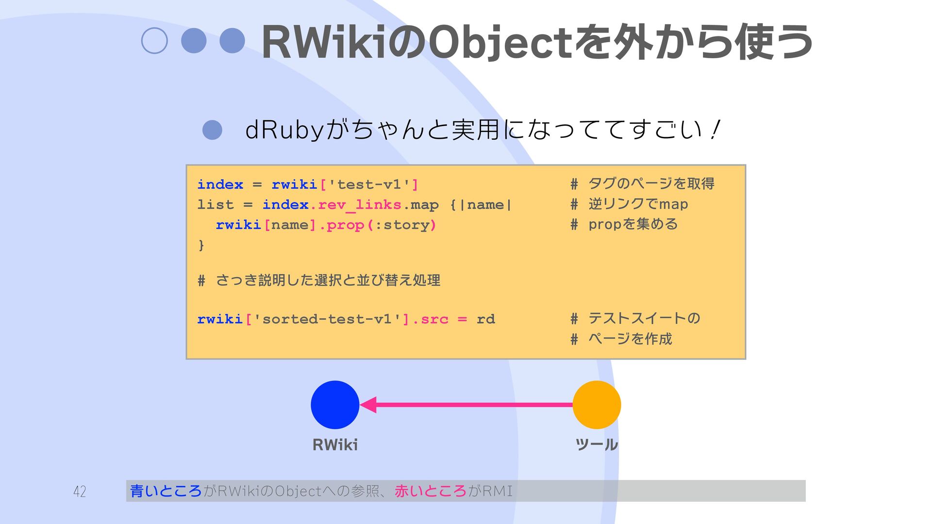 RWikiのObjectを外から使う 青いところがRWikiのObjectへの参照、赤いところがRMI 42 dRubyがちゃんと実用になっててすごい! RWiki ツール index = rwiki['test-v1'] #