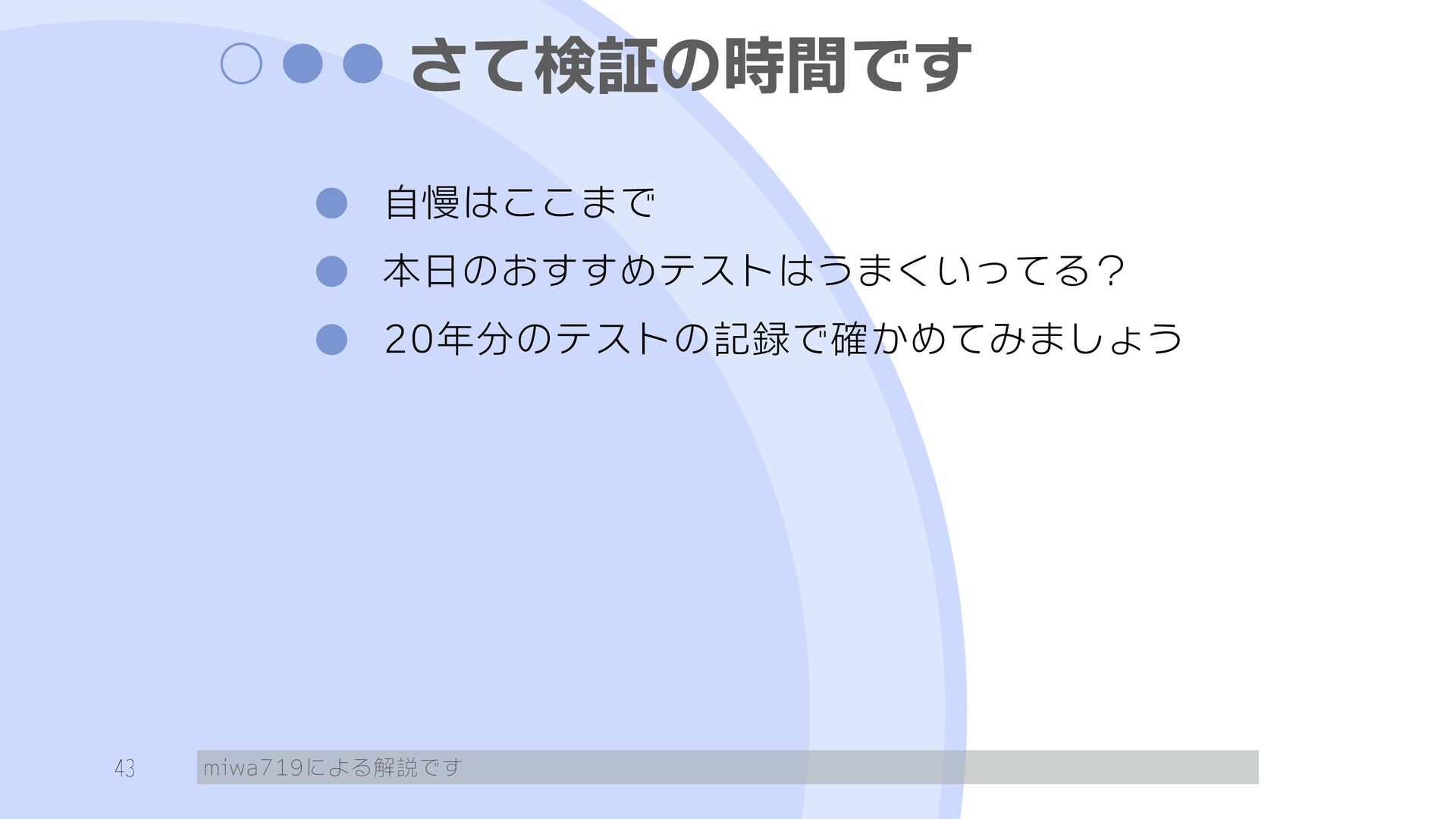 さて検証の時間です miwa719による解説です 43 自慢はここまで 本日のおすすめテストはうまくいってる? 20年分のテストの記録で確かめてみましょう