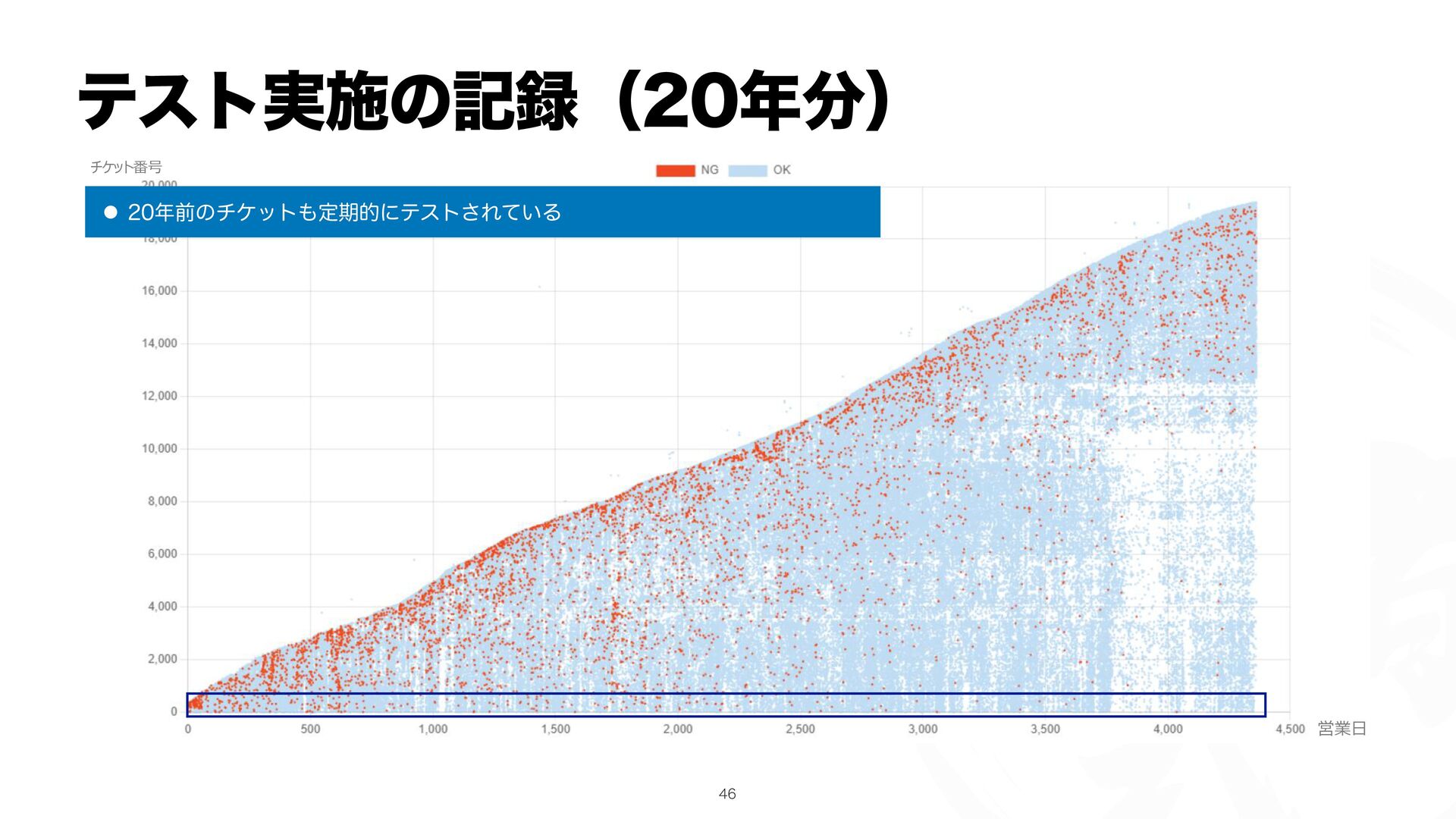ςετ࣮ࢪͷهʢʣ テスト実施の記録(20年分) 57 営業日 チケット番号 September 2023 NGの点はよく見えるように強調しています ͜ͷۭനଳ࣍ੈͷʹγϑτͨ࣌͠ظ