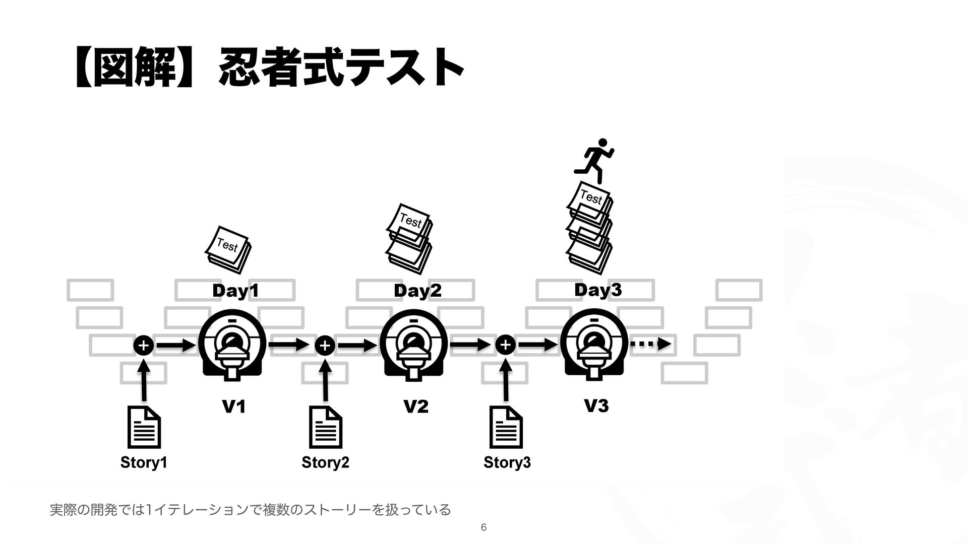 ʲਤղʳऀࣜςετ ࣮ࡍͷ։ൃͰΠςϨʔγϣϯͰෳͷετʔϦʔΛѻ͍ͬͯΔ 【図解】忍者式テスト 15 September 2023 実際の開発では1イテレーションで複数のストーリーを扱っている Day1 V1