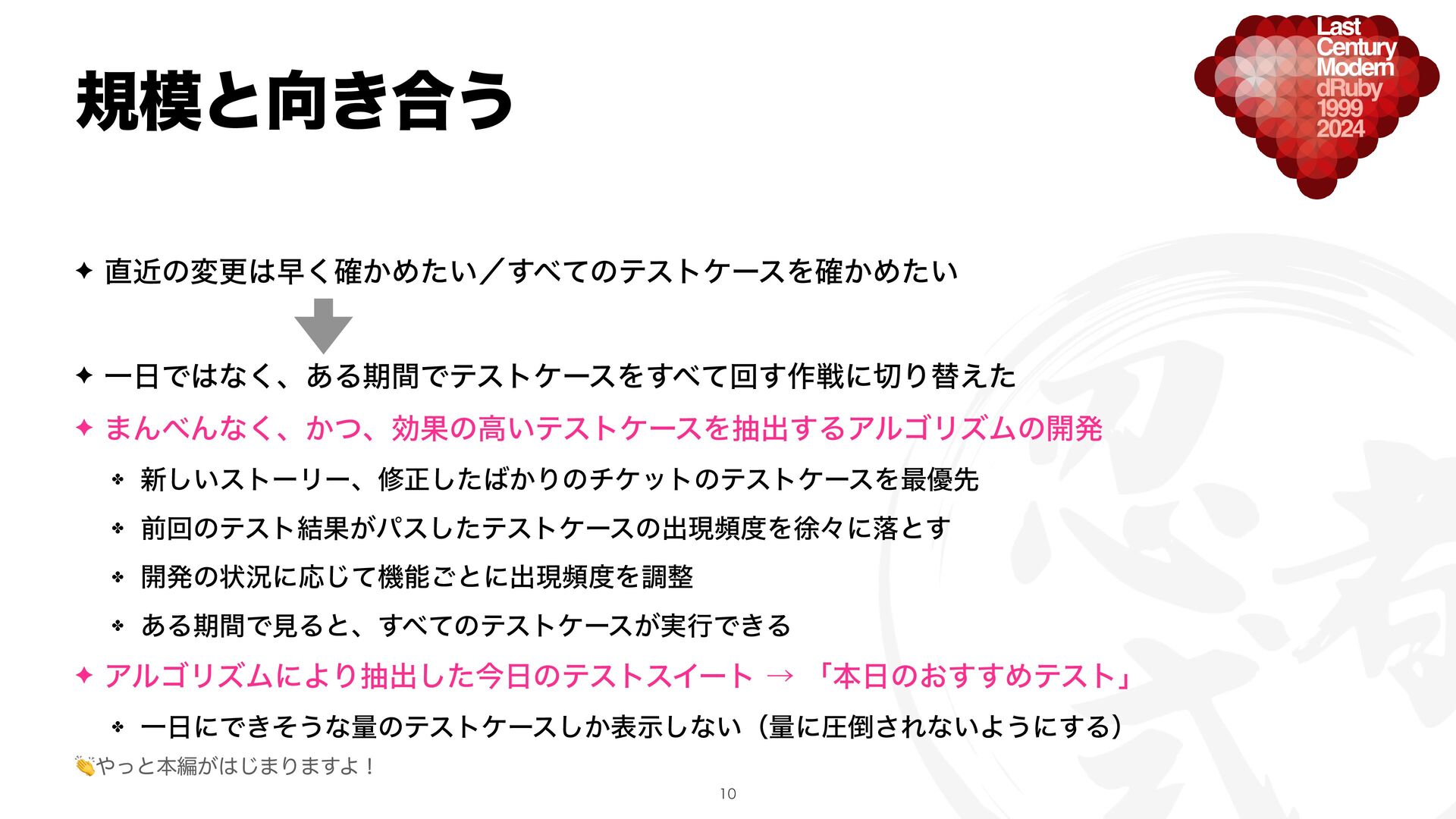 نͱ͖߹͏ ✦ ۙͷมߋૣ͔֬͘Ί͍ͨʗͯ͢ͷςετέʔεΛ͔֬Ί͍ͨ ✦ ҰͰͳ͘ɺ͋ΔظؒͰςετέʔεΛͯ͢ճ͢࡞ઓʹΓସ͑ͨ ✦ ·ΜΜͳ͘ɺ͔ͭɺޮՌͷߴ͍ςετέʔεΛநग़͢ΔΞϧΰϦζϜͷ։ൃ ✤ ৽͍͠ετʔϦʔɺमਖ਼͔ͨ͠ΓͷνέοτͷςετέʔεΛ࠷༏ઌ ✤