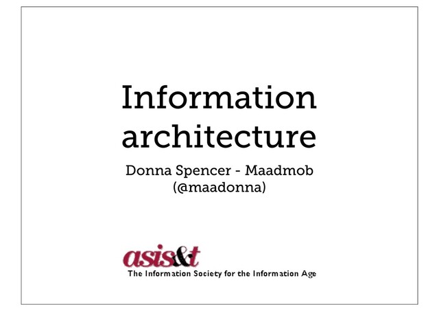 This was a virtual seminar I presented for ASIS&T in January 2011. There were some great questions, and I answered some on the IA book website. In this virtual seminar, you’ll learn all about information architecture – what it is, why it’s so important to do well and the major things to do and not to do. We’ll discuss: